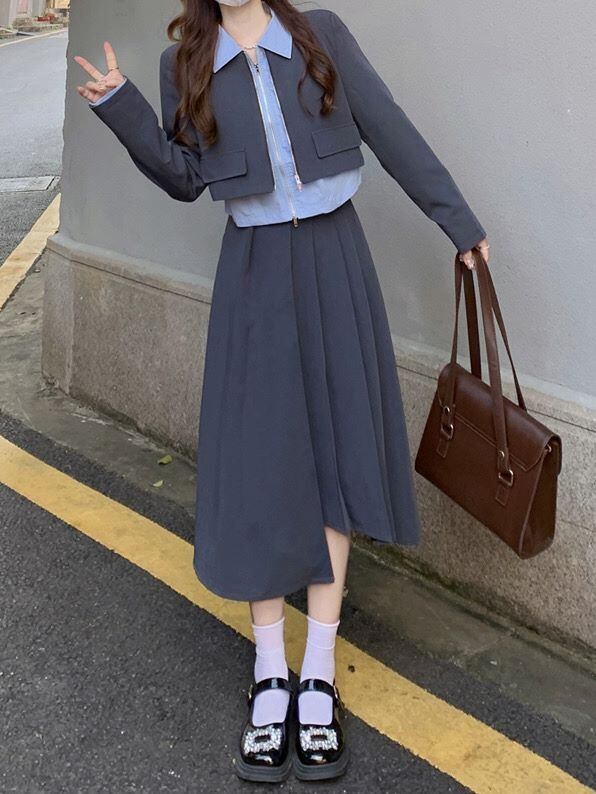 "アシメプリーツスカート×ジップシャツ×ジャケット 3点セット"