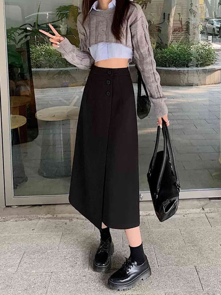 イレギュラーヘムハイウエストラップスカート クール 大人 カジュアル 黒 Aライン 大きいサイズ 韓国 CH6216