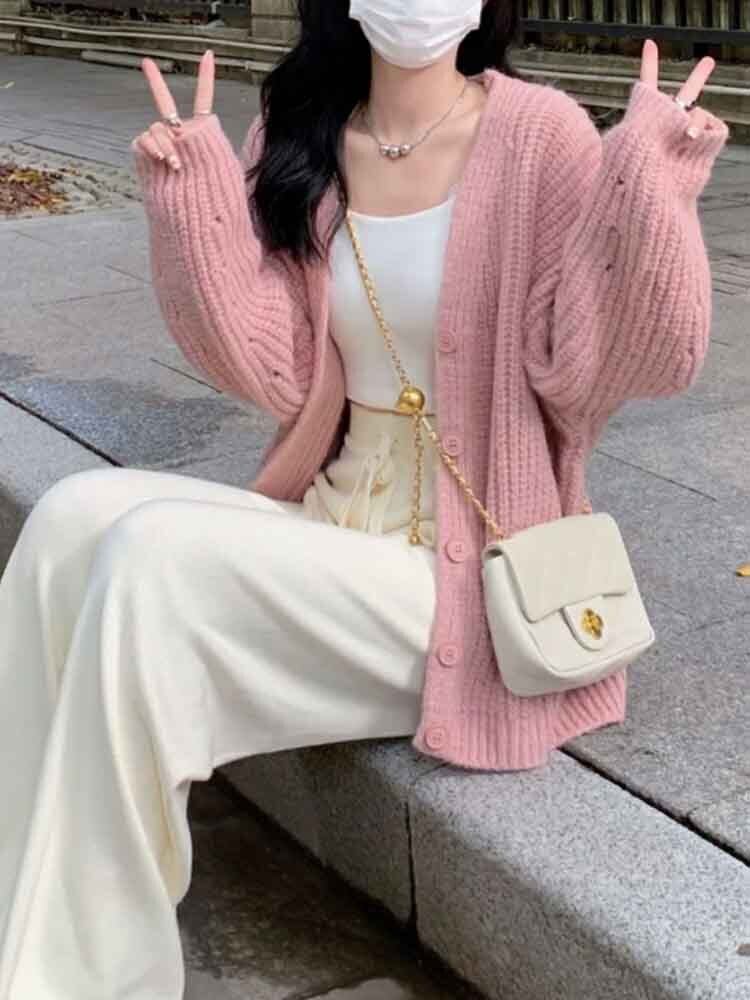 ピンクカラーがかわいい♡大きめのサイズ感でゆる可愛く着こなせるニットカーデです。