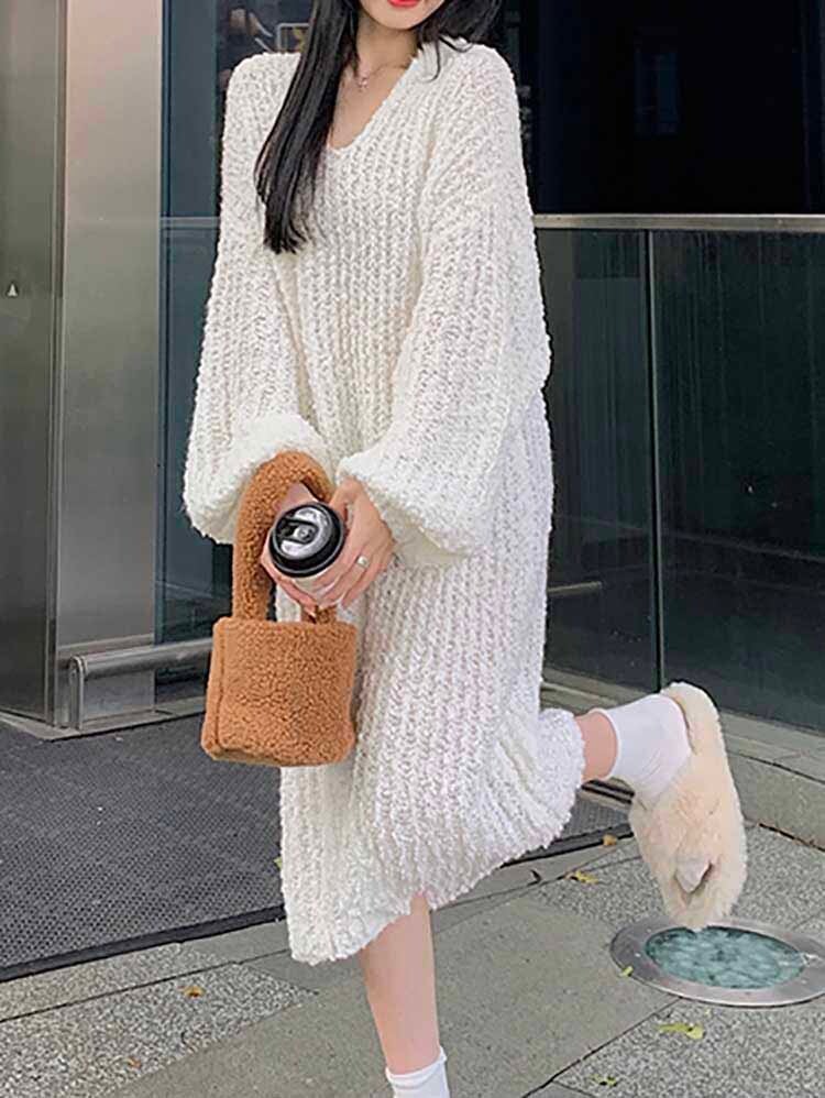 ゆる編みニットもこもこフード付きワンピース 休日コーデ カジュアル かわいい ガーリー ニットワンピ 大きいサイズ 韓国 CH6408