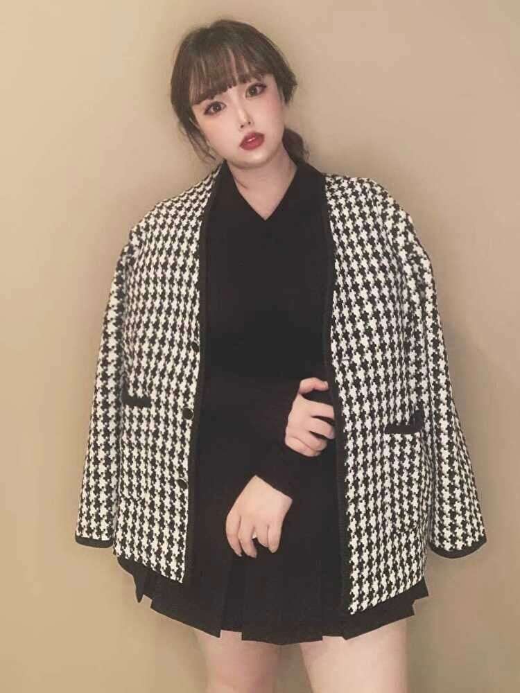 シンプルな存在感【再登場】千鳥格子ノーカラージャケット エレガントコーデ かわいい 着映え Vネック 人気 大きいサイズ 韓国 CH7109