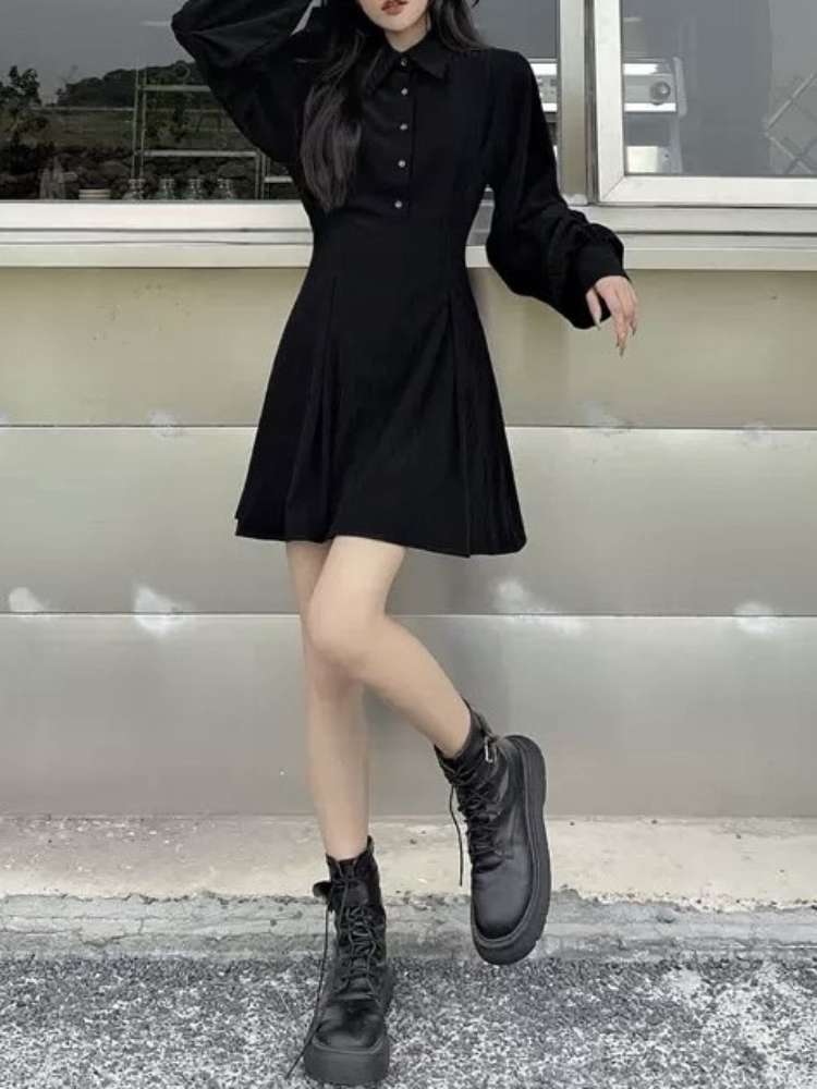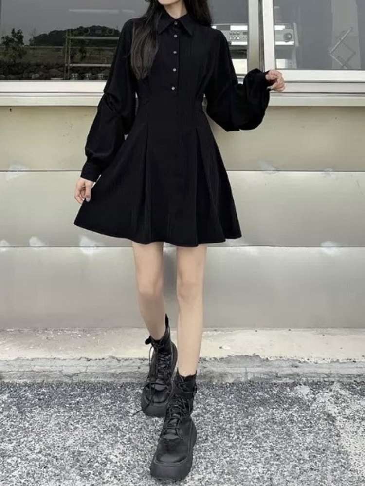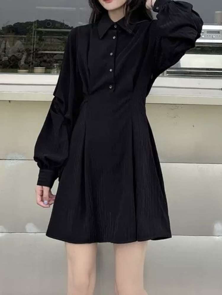 ボリュームスリーブウエストタックシャツワンピ ミニワンピ かわいい カジュアル 襟付き フレア 黒 大きいサイズ 韓国 CH7209
