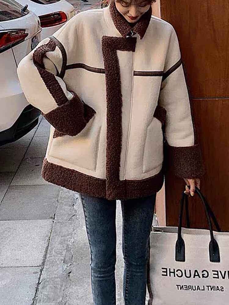裏ボアバイカラーフェイクムートンジャケット カジュアル アウター メンズライク 配色 ゆったり 大きいサイズ 韓国 CH7292