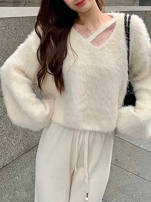 "アシンメトリーネッククロップド丈シャギーニットトップス"