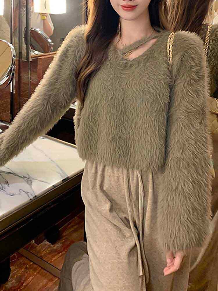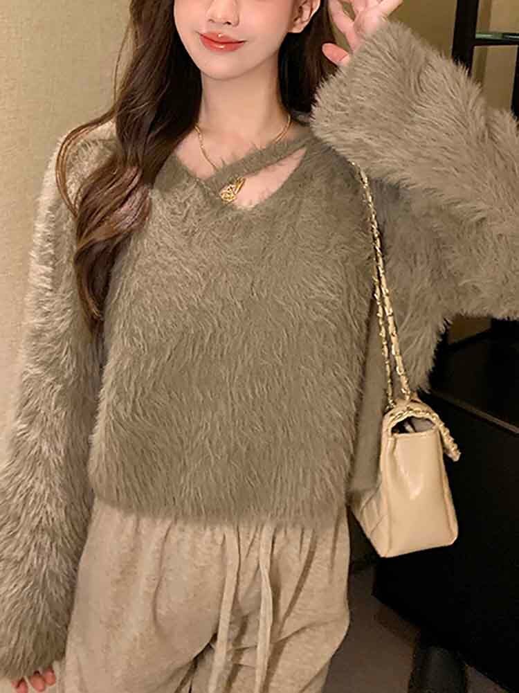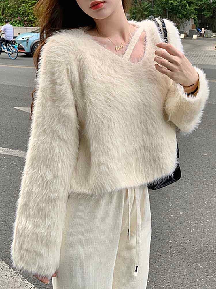 アシンメトリーネッククロップド丈シャギーニット カジュアル かわいい シンプル セーター 大きいサイズ 韓国 CH8009