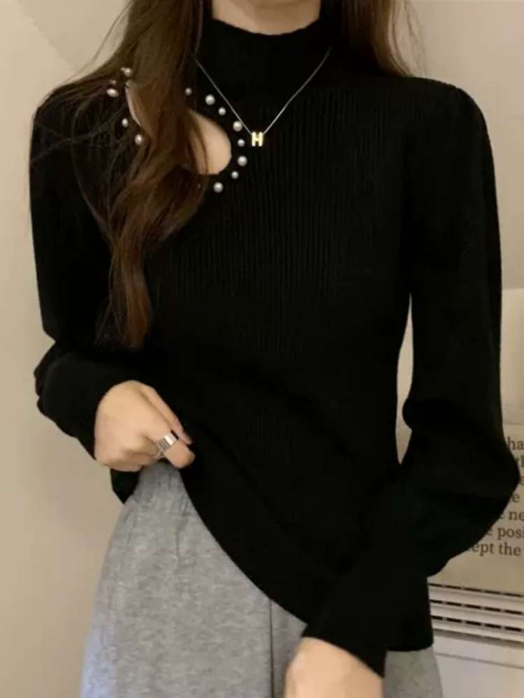 デコルテビジューカットアウトリブニット オープン ニット ビジュー ハイネック コットン セーター カジュアル 無地 大きいサイズ 韓国 CH8073