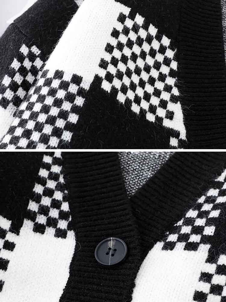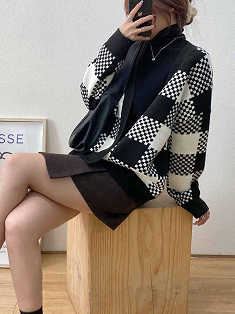 ジャガードチェック柄Vネックニットカーデ 大人カジュアル きれいめ 柄 セーター モノトーン 大きいサイズ 韓国 CH8125