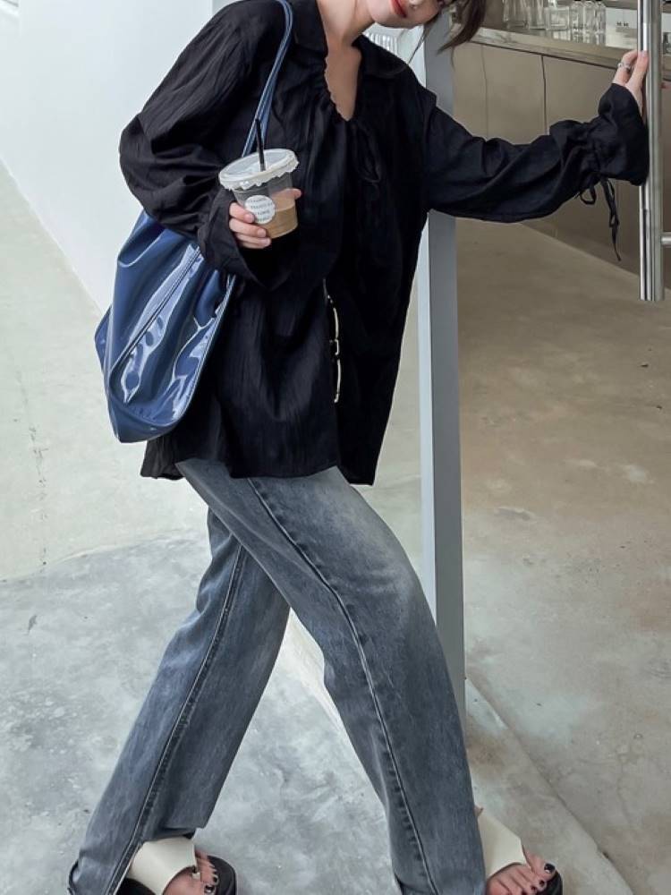 ラウンドネックワッシャーブラウス ゆったりカジュアル しわ加工シャツ 長袖 無地 シンプル 大きいサイズ 韓国 CH8303