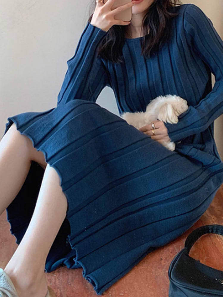 太めリブニットロングワンピース 大人きれいめコーデ シンプル かわいい ラウンドネック 春秋 大きいサイズ 韓国 CH8193