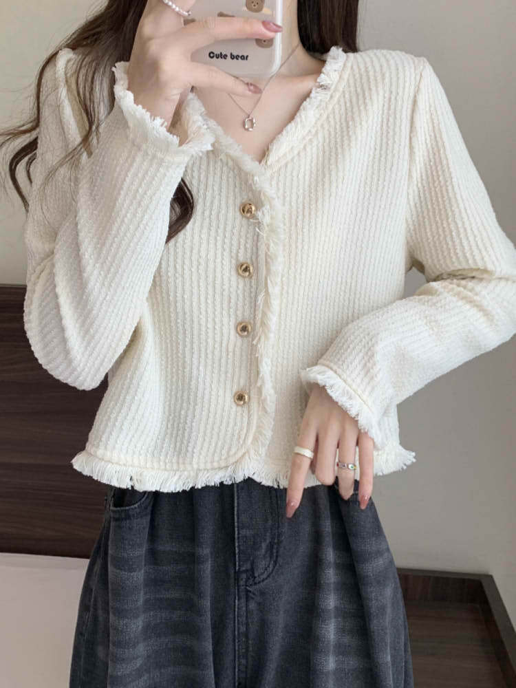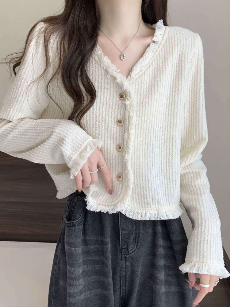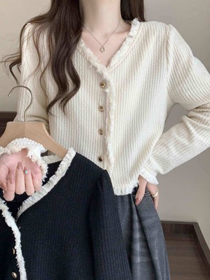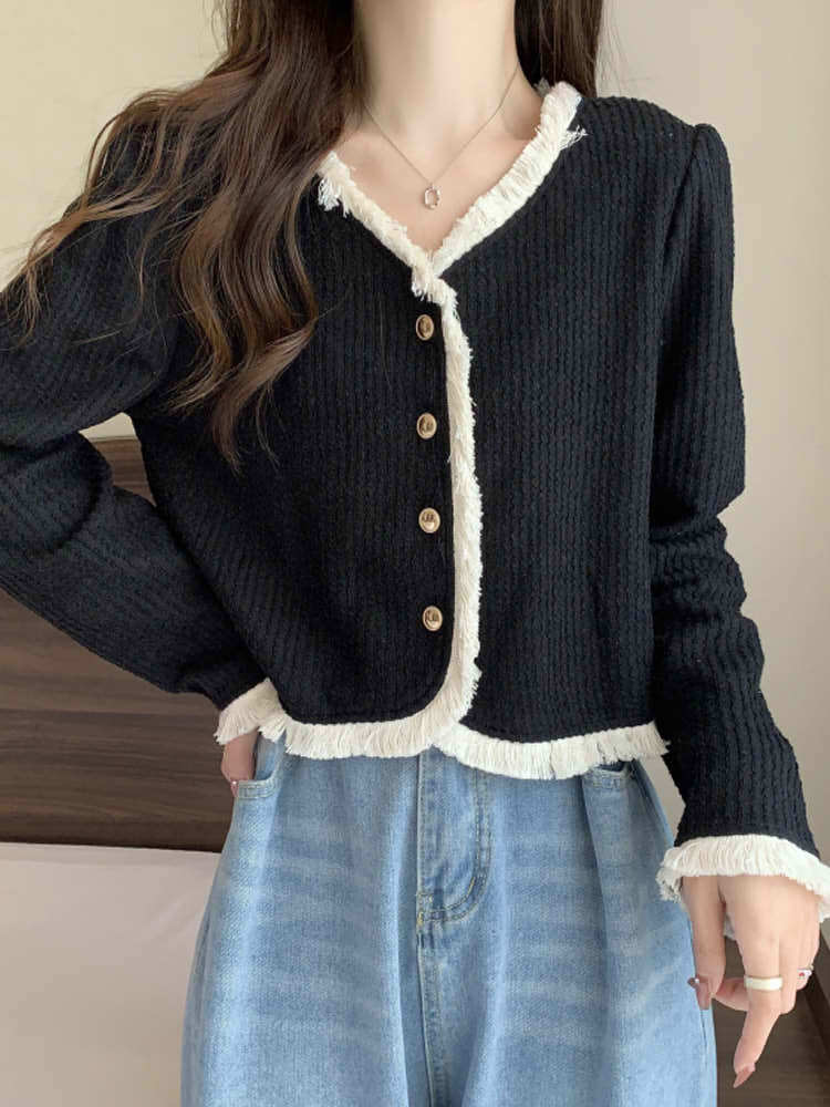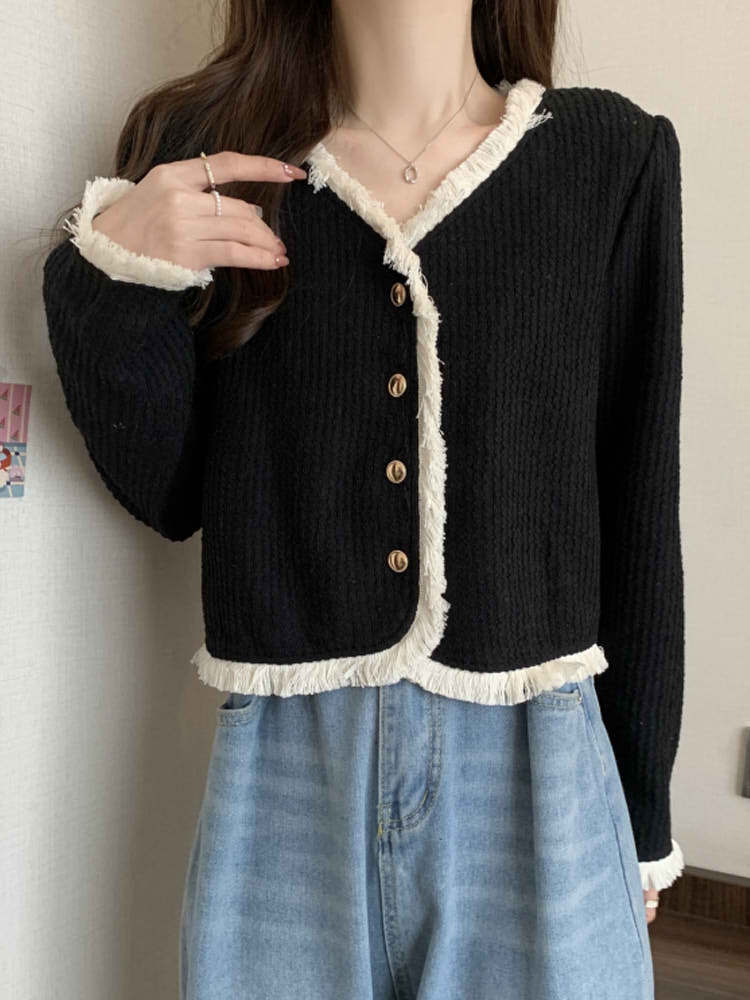 フリンジパイピングコットンカーディガン オフィスカジュアル かわいい きれいめ プチプラ 春夏 大きいサイズ 韓国 CH8231