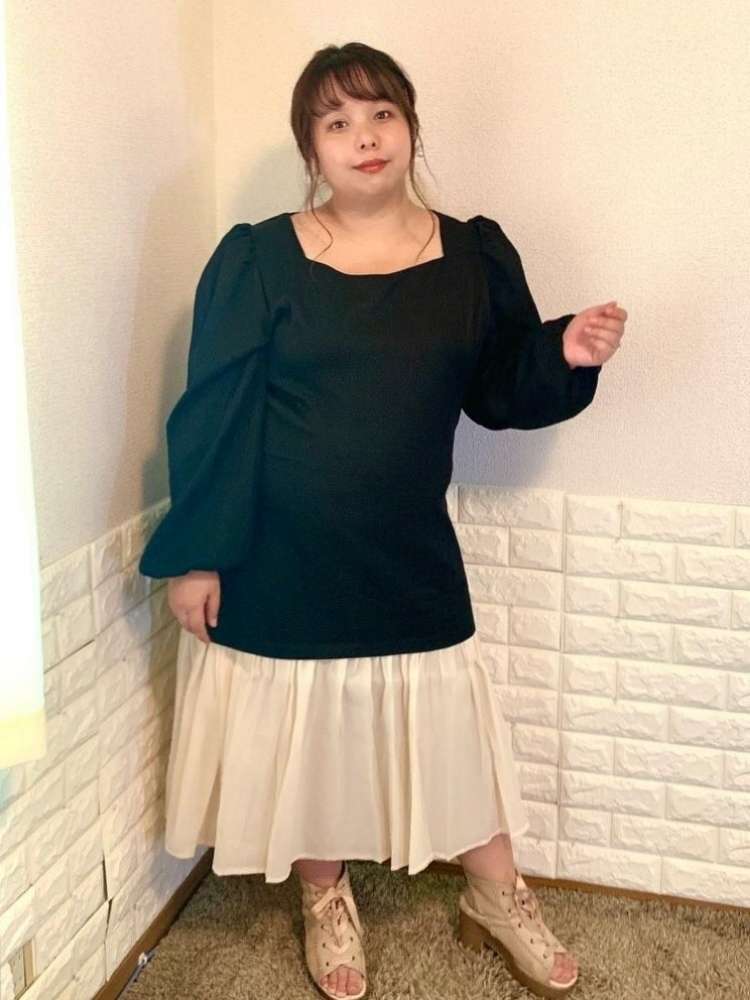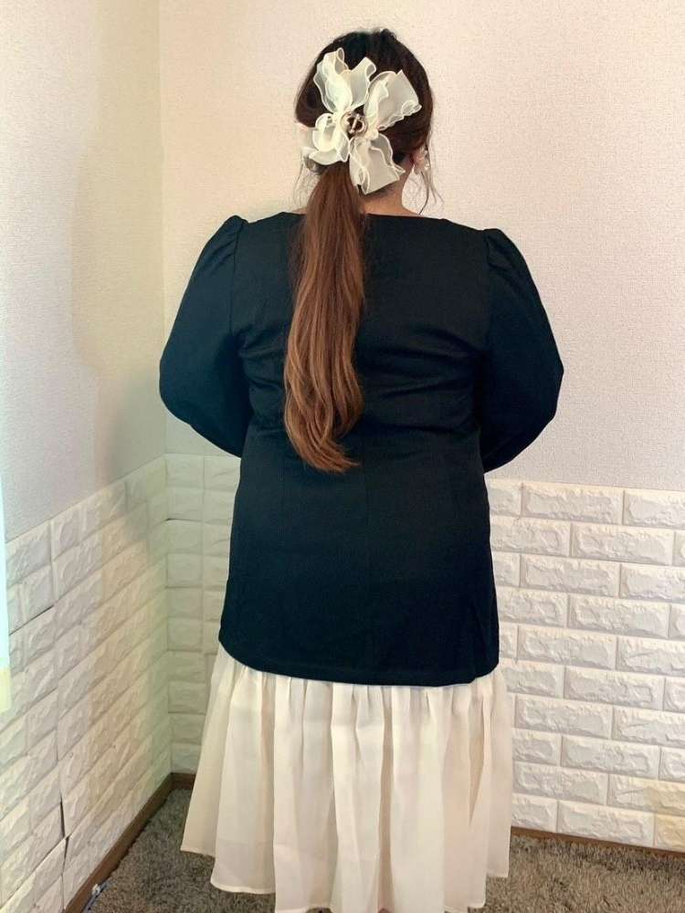 ボディはモード感のあるシンプルデザインに、袖のボリュームが特徴的。大きく開いたネックラインにパフスリーブで華奢見えしますよ♪