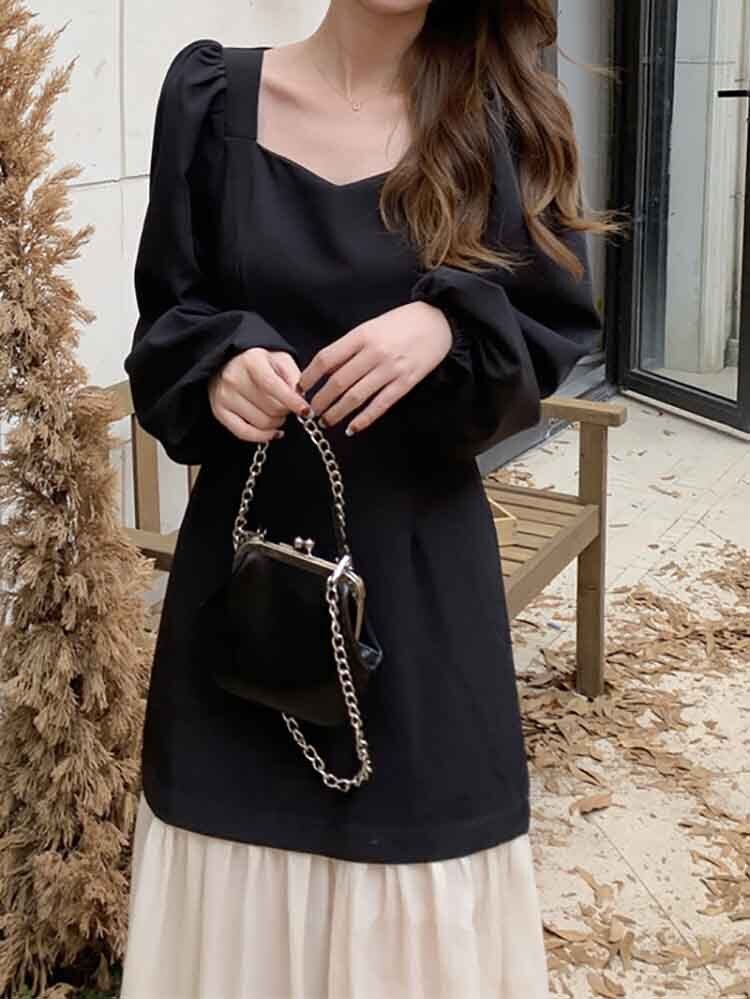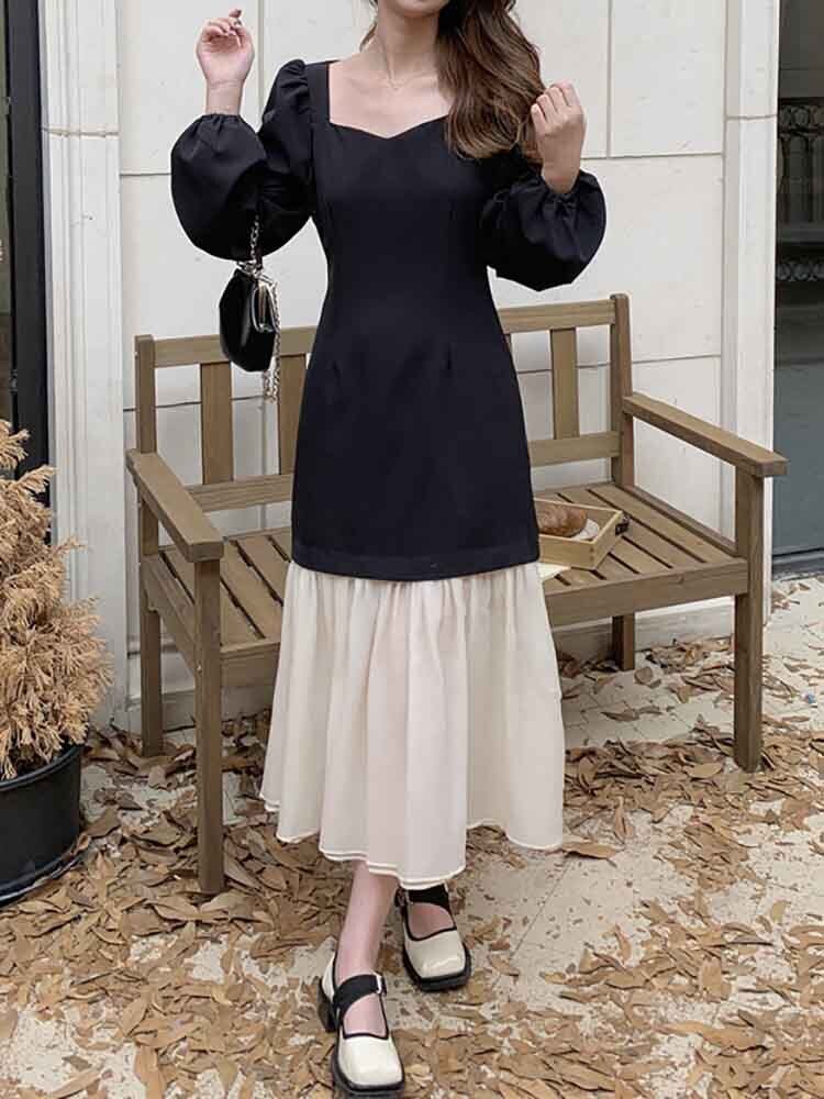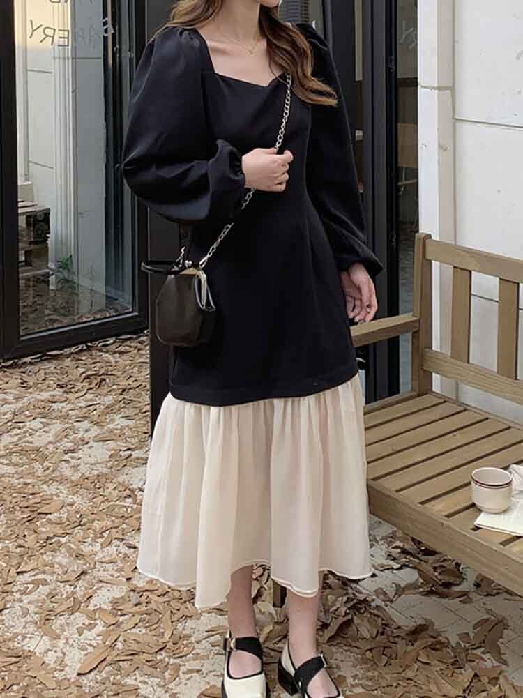 異素材切り替えモノトーンワンピース きれいめ カジュアル スクエアネック パプスリーブ バイカラー 大きいサイズ 韓国 CH8348