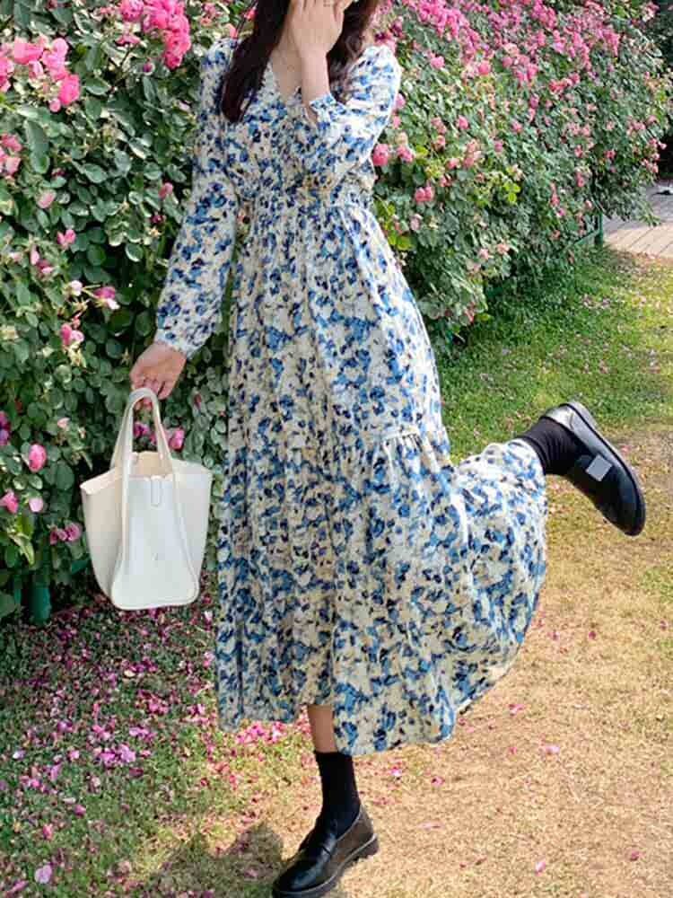 ティアードカシュクールロングワンピース 大人かわいい きれいめ デート おでかけ リゾート 花柄 春 大きいサイズ 韓国 CH8460