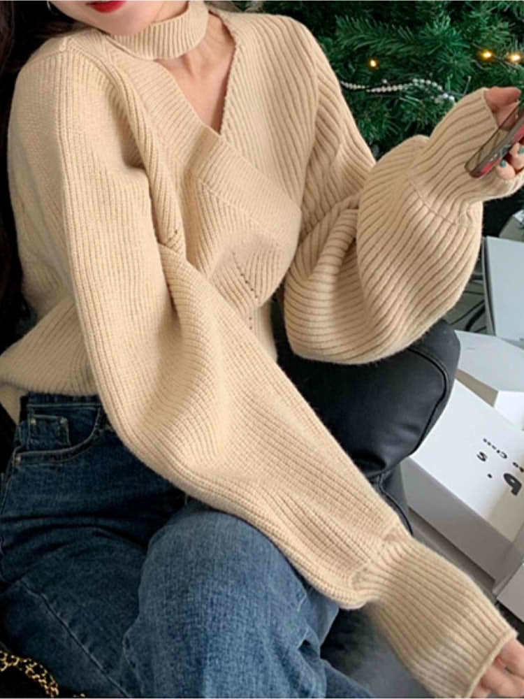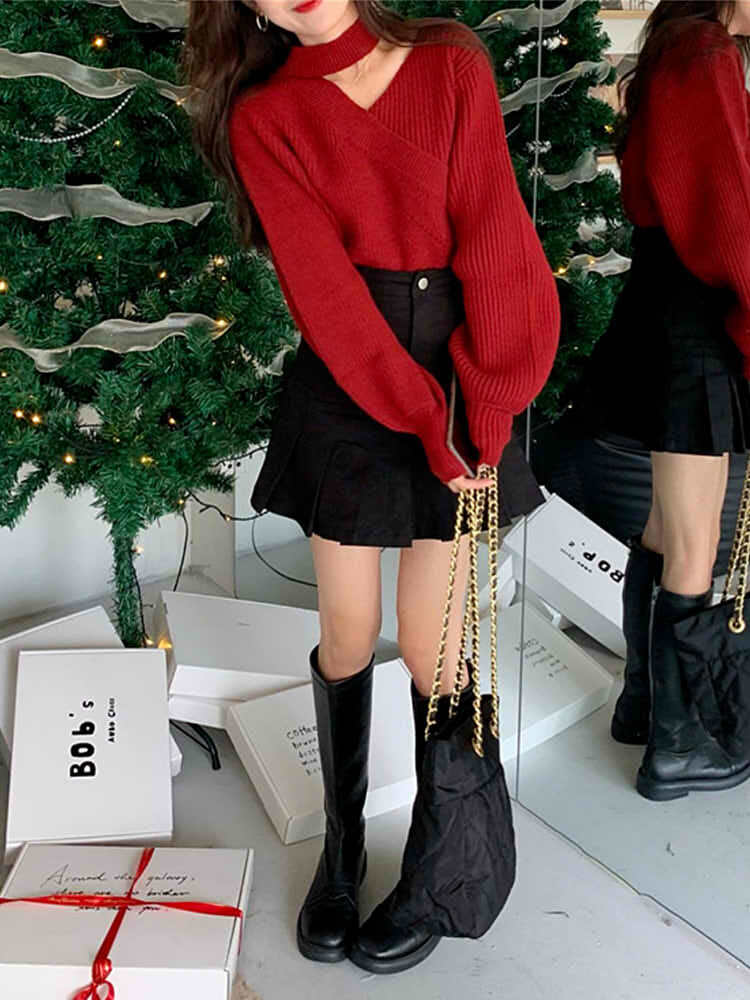 デコルテラインを美しく魅せる アシメデコルテカットアウトニット セクシーコーデ きれいめ カジュアル おしゃれ ハイネック 大きいサイズ 韓国 CH8559