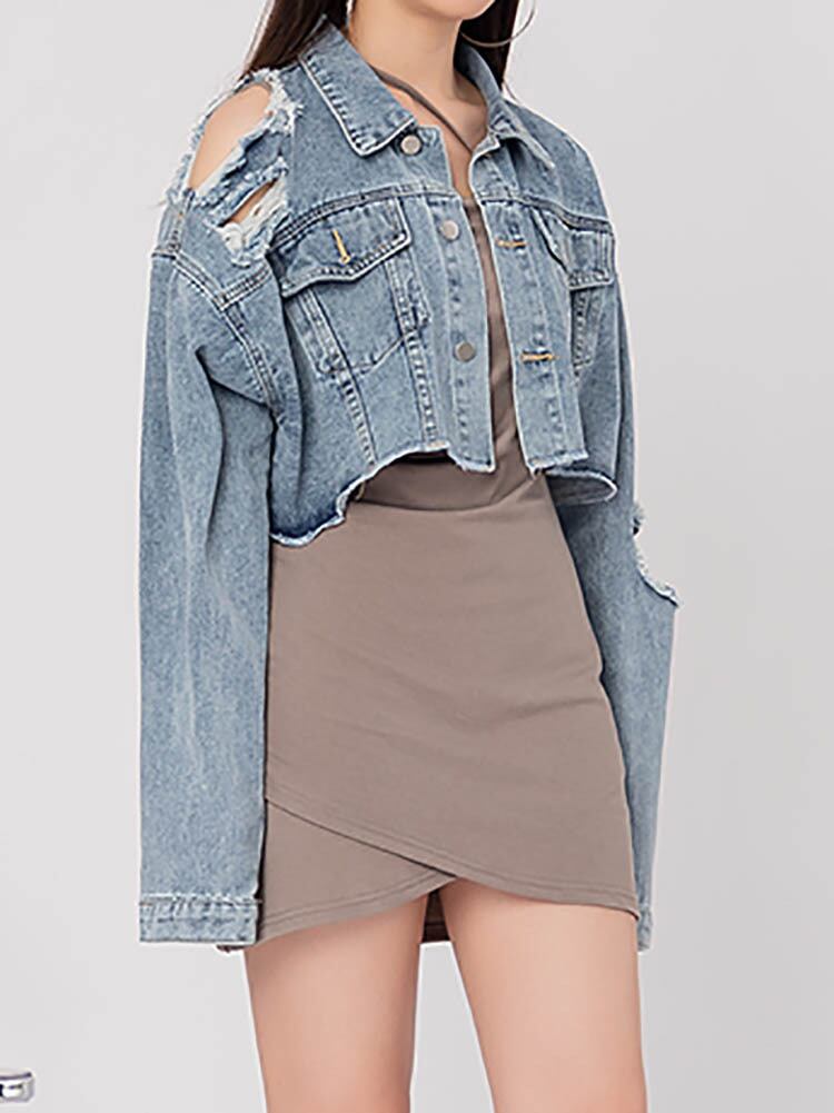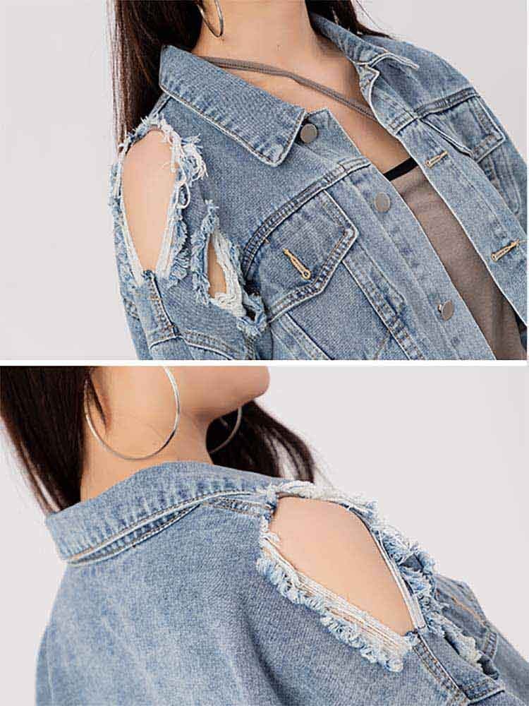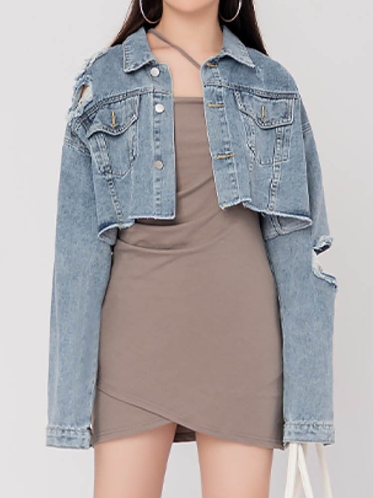 こだわりスタイルを作るなら クラッシュ加工クロップド丈デニムジャケット カジュアル おしゃれ 色落ちデニム ダメージ加工 ドロップショルダー アウター 大きいサイズ 韓国 CH8698