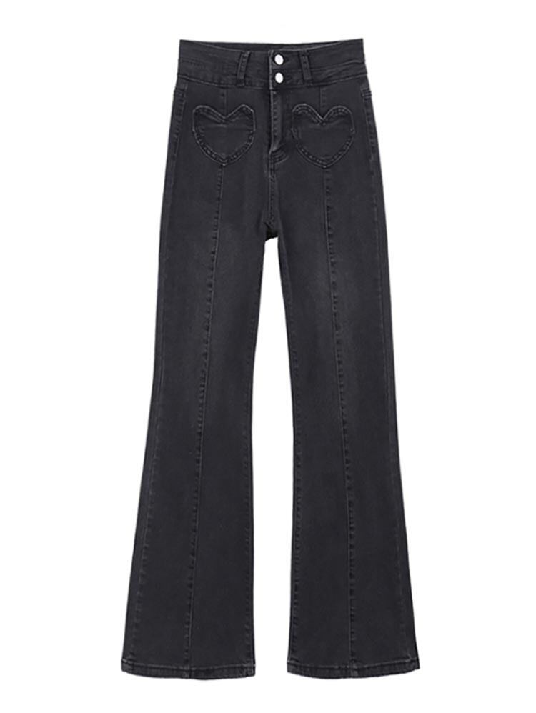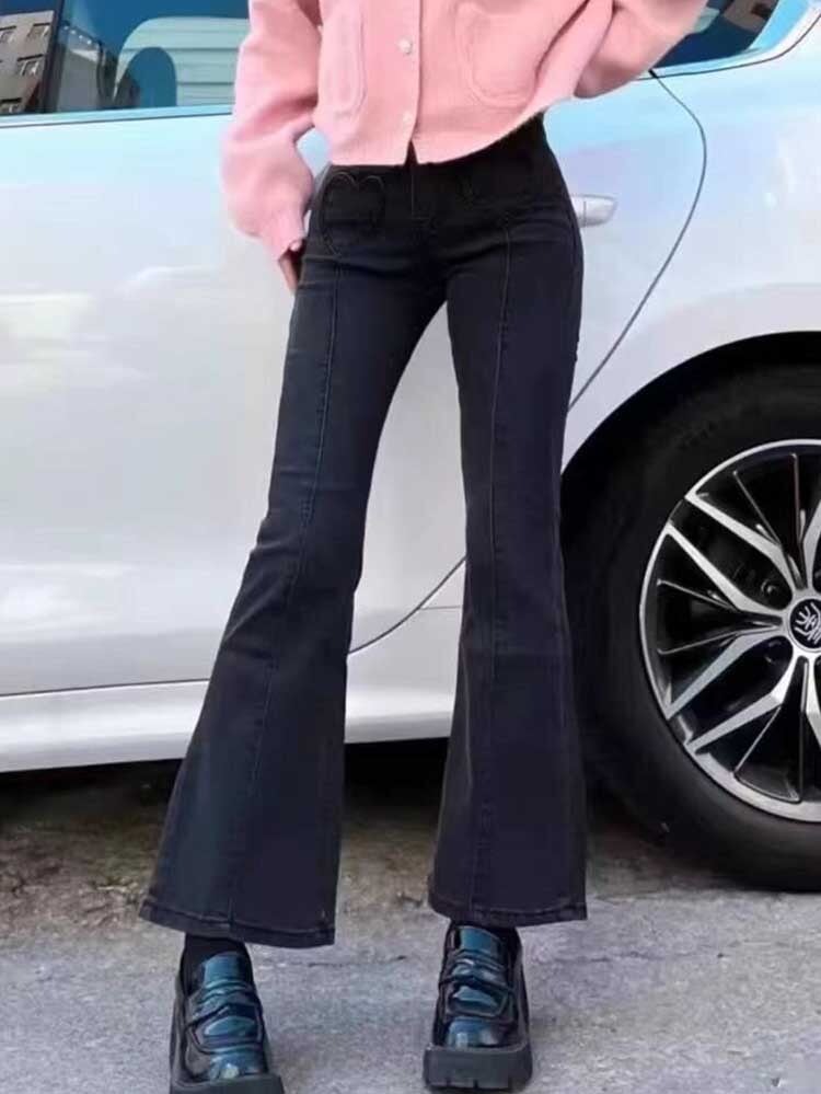 クールと可愛い両方が欲しい! ハートポケットクロップド丈ブーツカットデニム カジュアル パンツ 9分丈 黒 ハイウエスト ストレッチ 大きいサイズ 韓国 CH8686