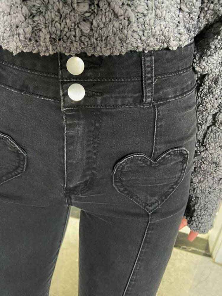 大人カジュアルに活躍するブラックデニム☆ハート型のポケットがアクセントになりさりげなくかわいさがプラスされた1枚です!