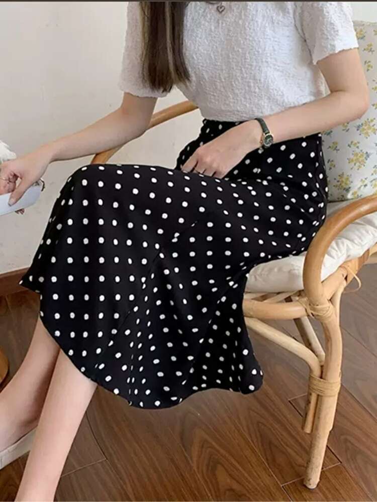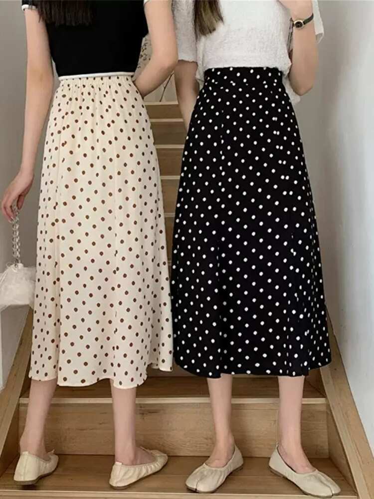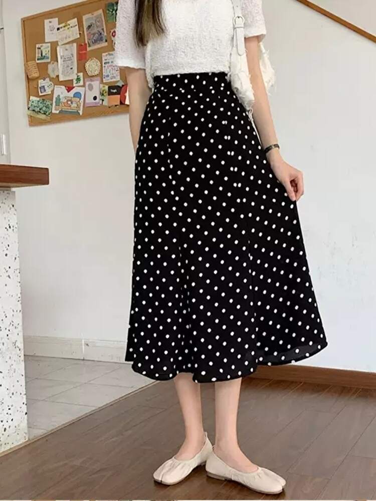 シンプルなデザインで使いやすい ミモレ丈ドットスカート ハイウエスト ベージュ ブラック 春 夏 韓国 大きいサイズ CH8446