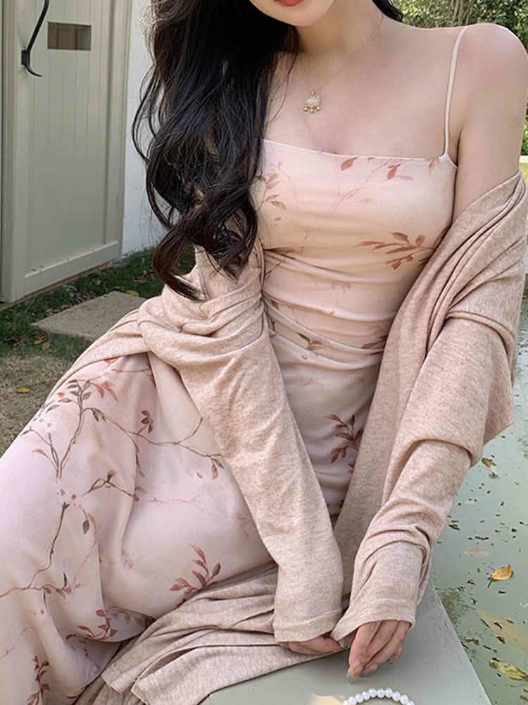 "オーバーサイズロングカーディガン×花柄タイトキャミワンピース コーデセット"