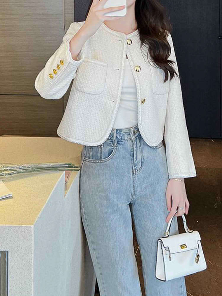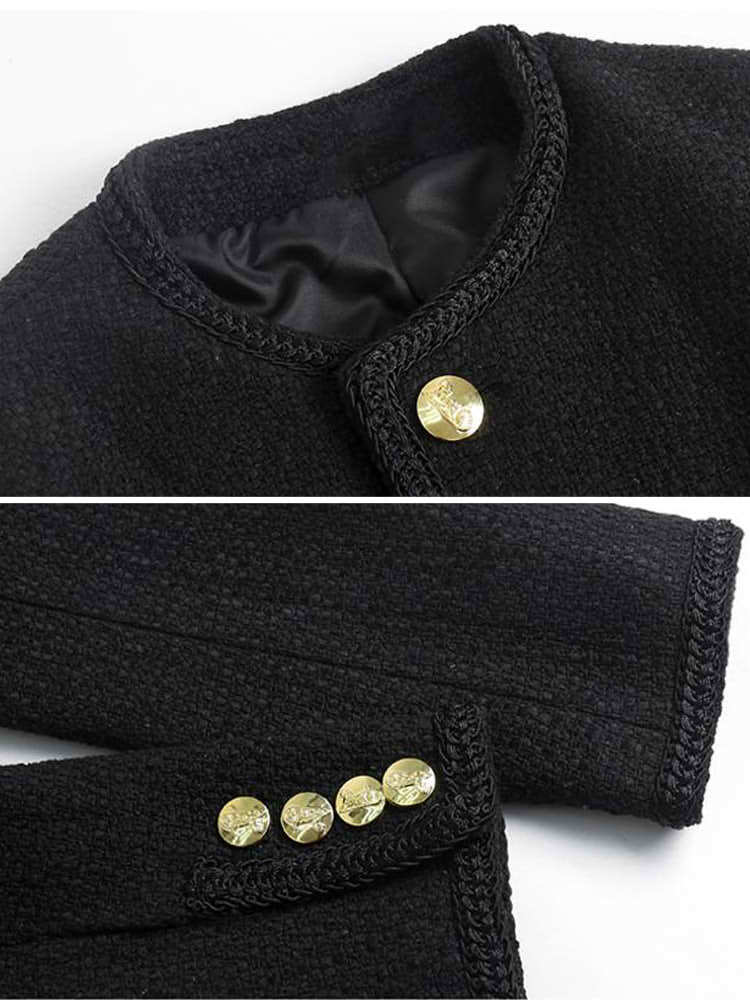表面感のある鎖型縁取りや大きめのゴールドボタン、高級さ漂うツイード生地が大人の上品さを演出♪