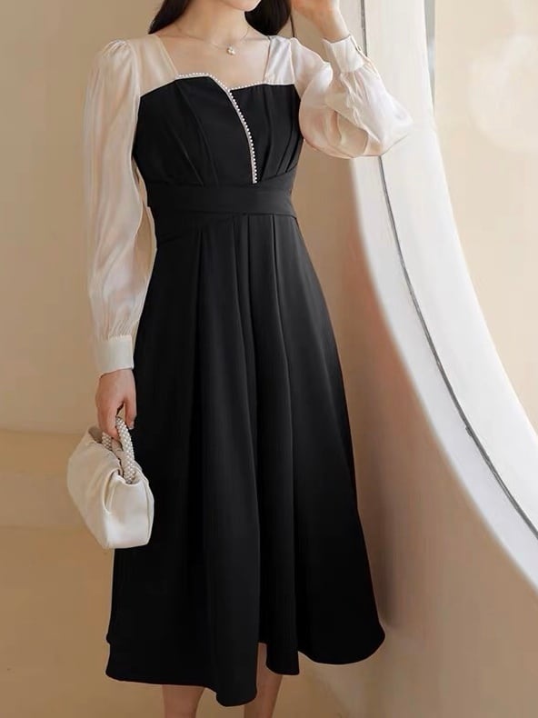 上品さと可愛さを兼ね備えたワンピースドレス ビスチェ風ミモレ丈バイカラーワンピース ミモレ丈 おしゃれ 上品 大人可愛い 大きいサイズ 韓国 CH8840