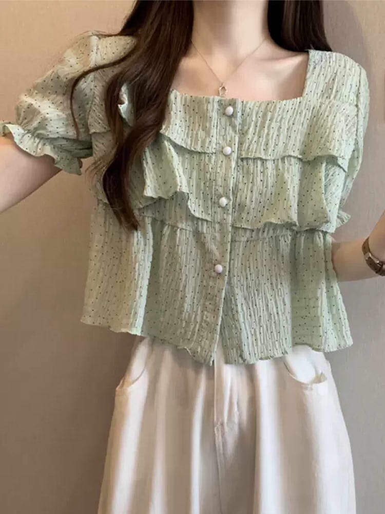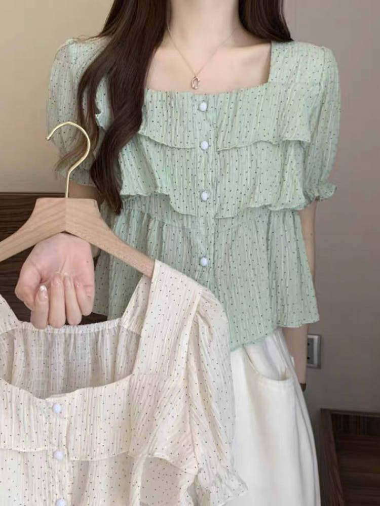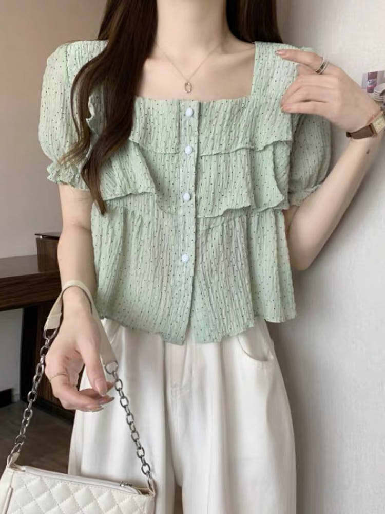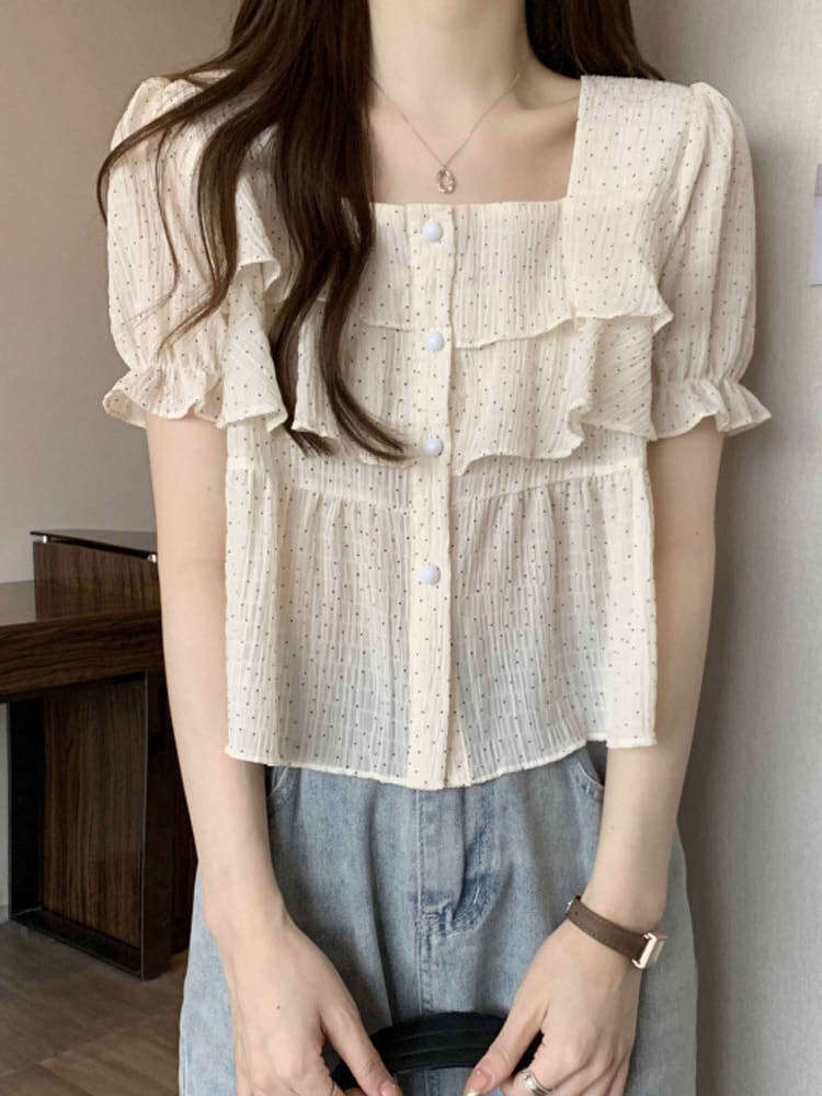 ひらりと揺れるフリルが女っぽ 3段フリルスクエアネックブラウス カジュアルコーデ かわいい 夏 パフスリーブ プチプラ 大きいサイズ 韓国 CH8815