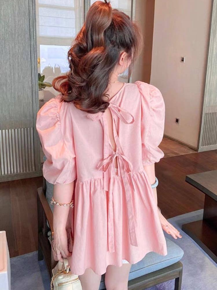 体型カバーも可愛いも叶う優秀アイテム バックリボンペプラムブラウス 半袖 リボン 大人可愛い フェミニン デート おでかけ 大きいサイズ 韓国 CH8878