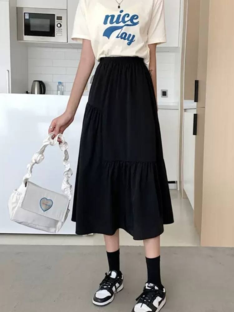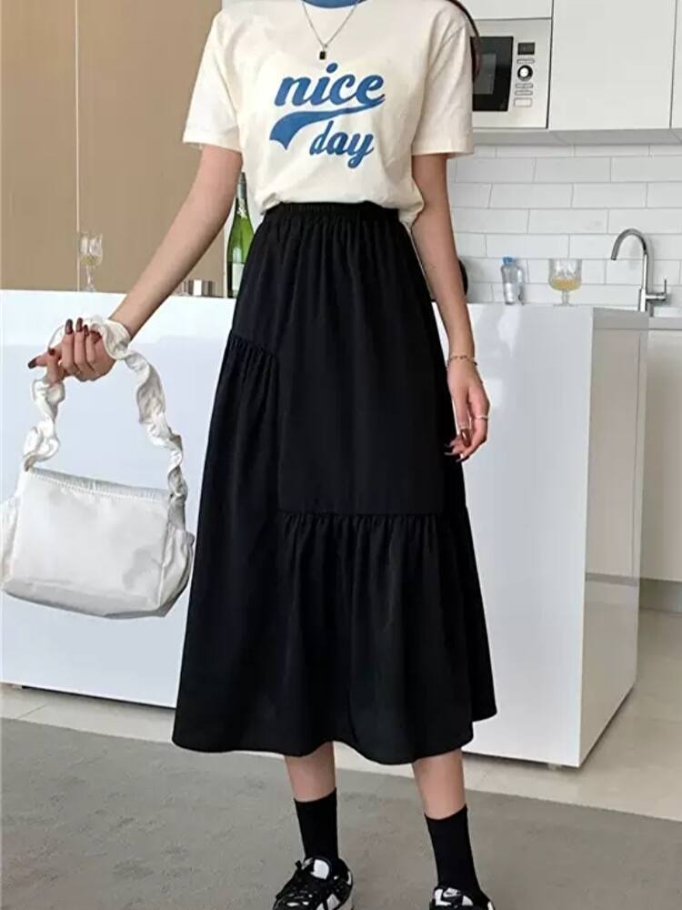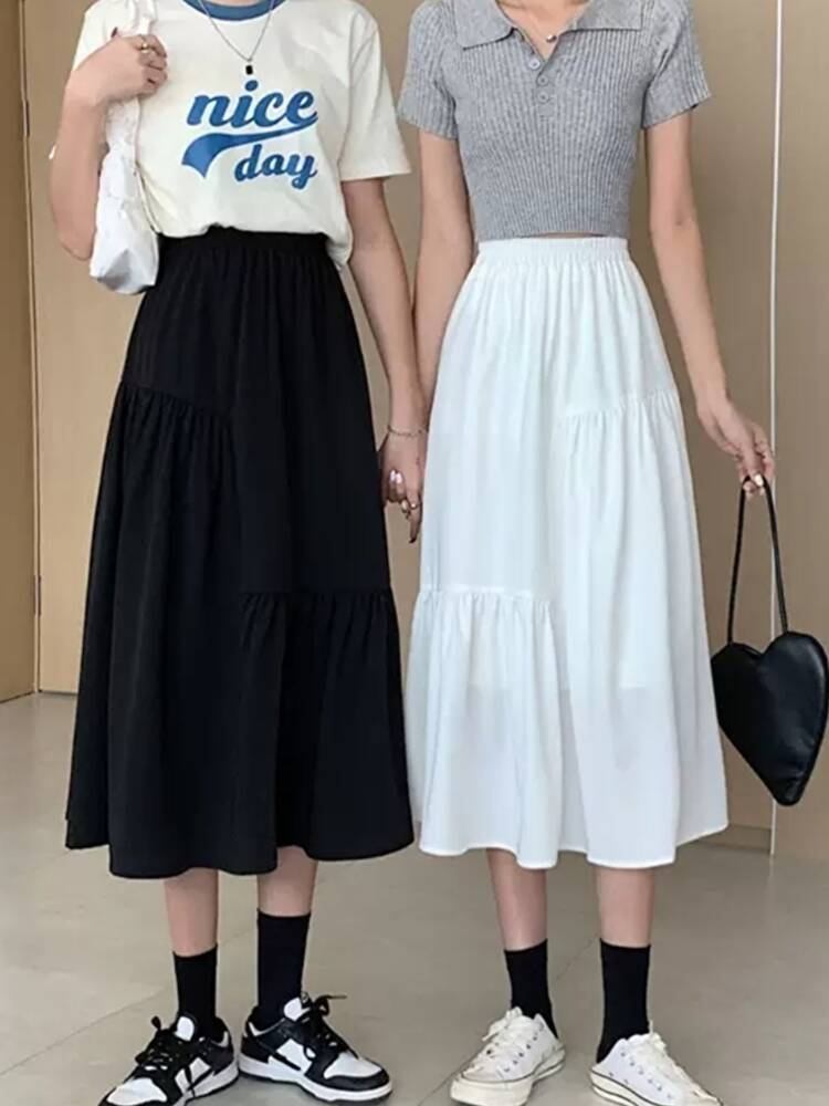 シンプルなデザインで、様々なトップスと合わせてコーディネートが楽しめる! 軽やかな生地感が風に揺れ、Aラインシルエットでヒップカバー◎ウエスト部分はゴム仕様で、着心地も抜群♪