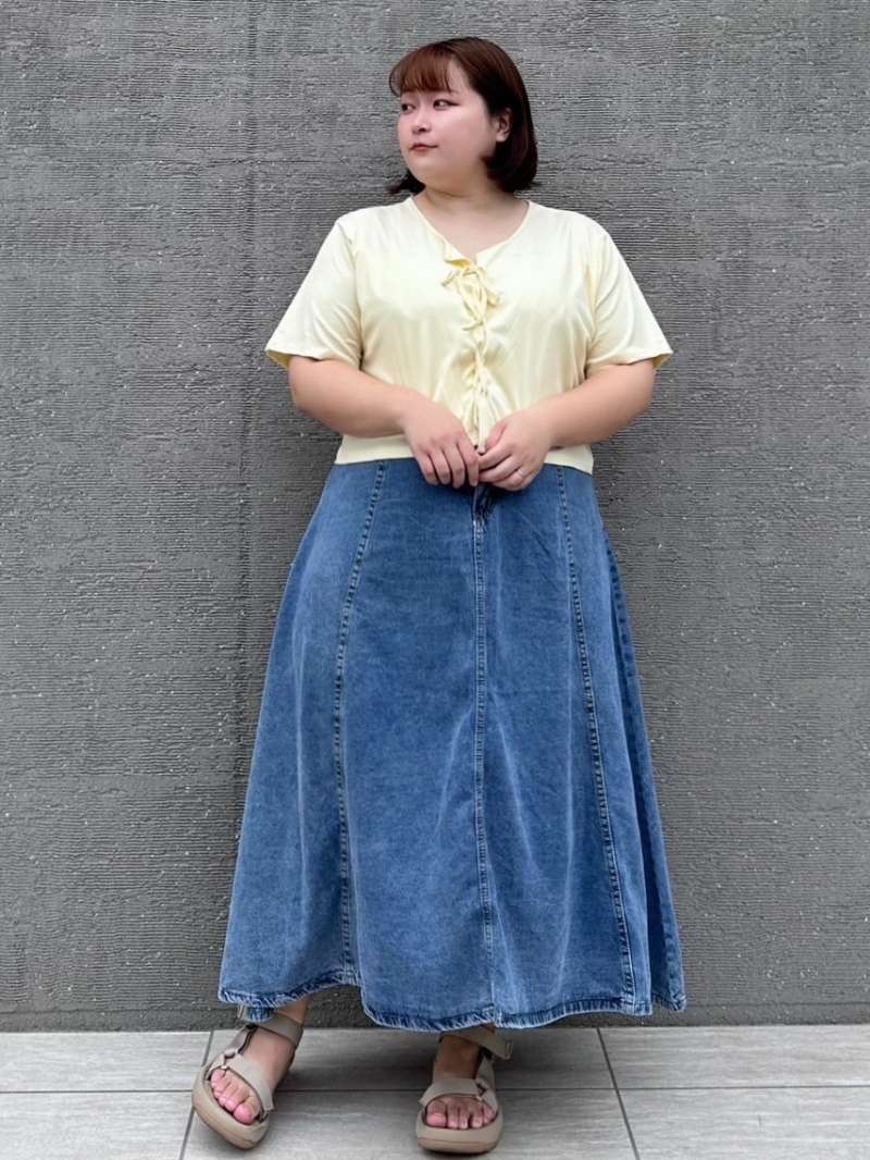 デニムロングスカートには、シンプルなTシャツを合わせてカジュアルなスタイルも◎