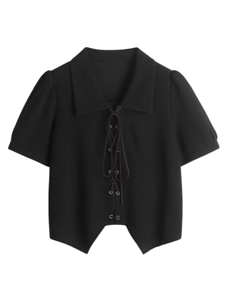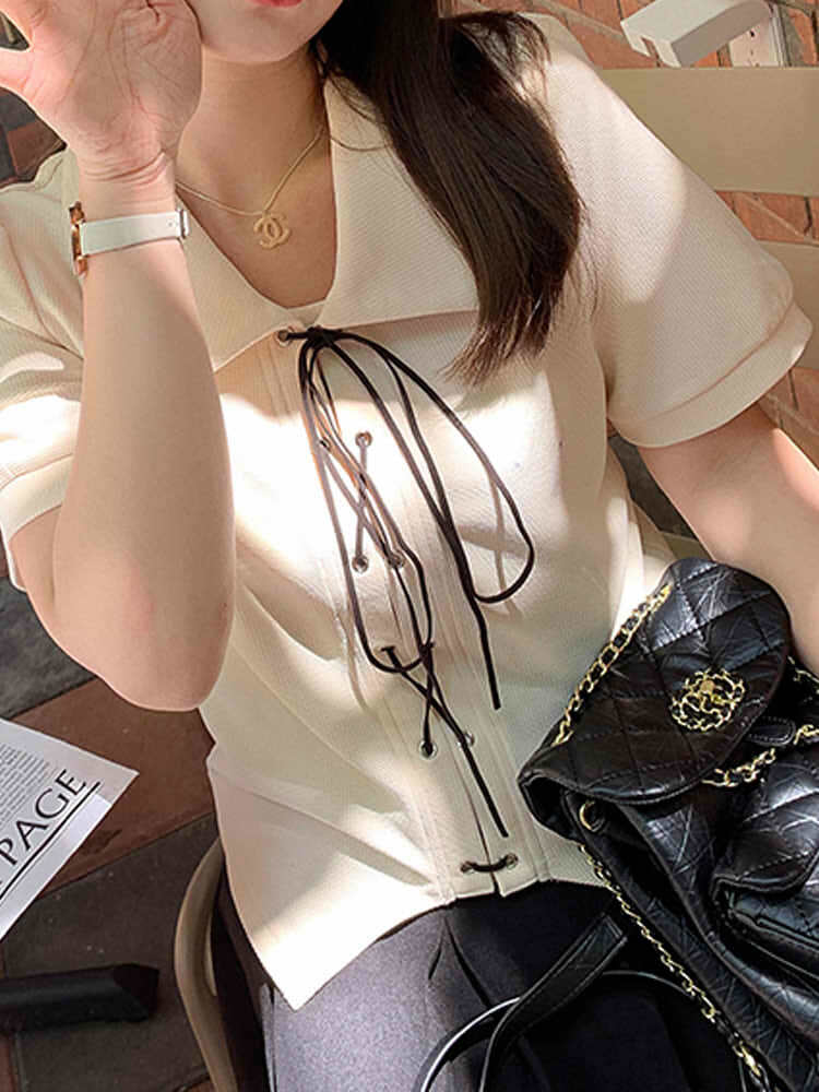 映えるレースアップでぐっとシャレ見え レースアップ半袖ブラウス カジュアルコーデ かわいい 夏 大きいサイズ 韓国 CH8956