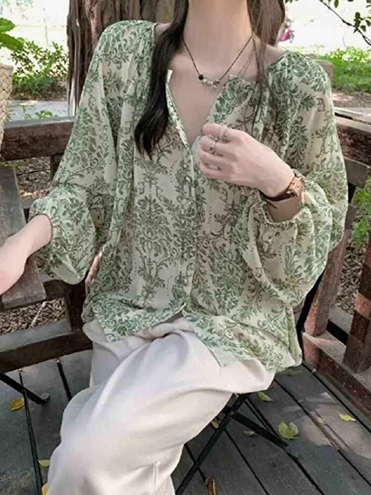 "シースルーで快適!ボタニカル柄シフォンブラウス"
