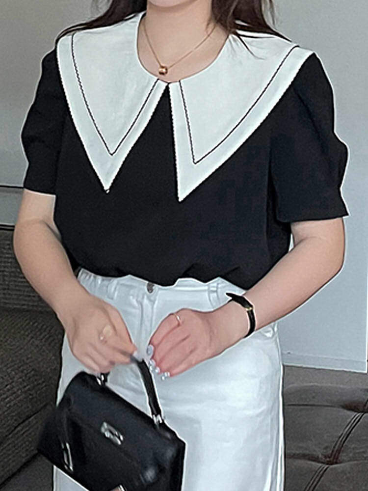 二重のビッグカラーがパッと目を惹く!シックなモノトーンの半袖ブラウスです。