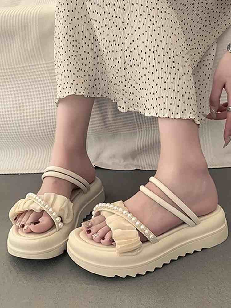 パールデザインがアクセントのエレガントな印象の厚底サンダル♩
