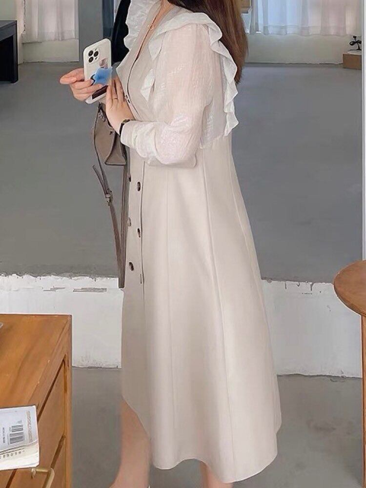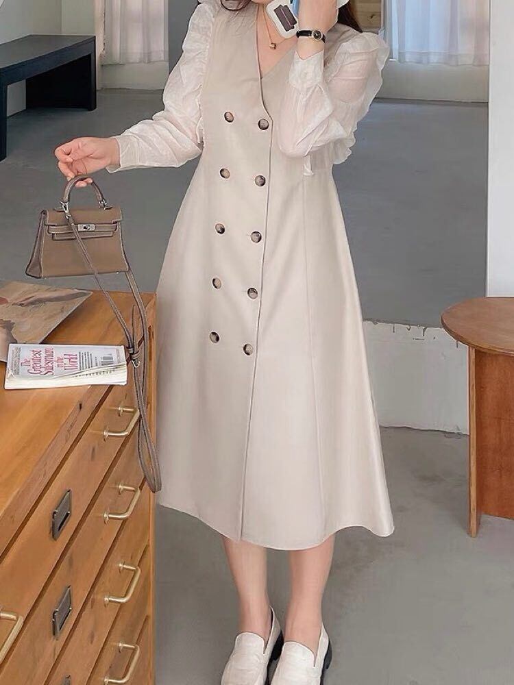 ツヤ感が大人可愛いきちんとワンピ トレンチ風ドッキングワンピース シアー Vネック 大人可愛い カジュアル きれいめ デート お出かけ 体型カバー 大きいサイズ 韓国 CH9366