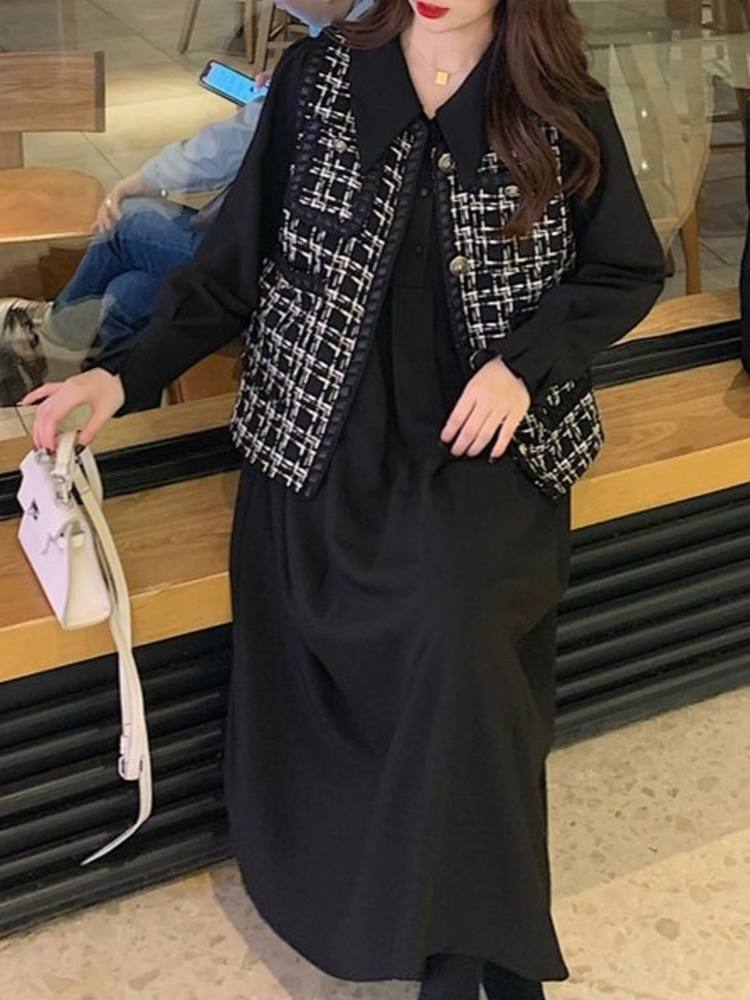 注目のトレンドコーデが完成 チェック柄ベスト×美ラインワンピース コーデセット きれいめ カジュアル 着回し 秋冬 大きいサイズ 韓国 CH9375