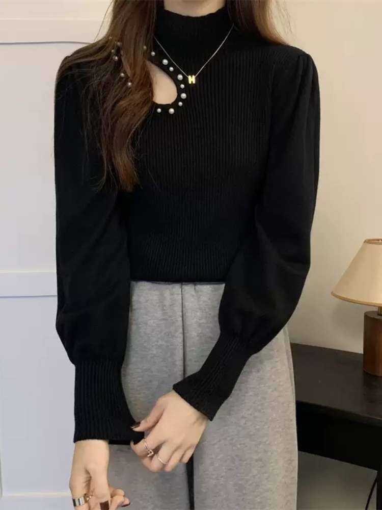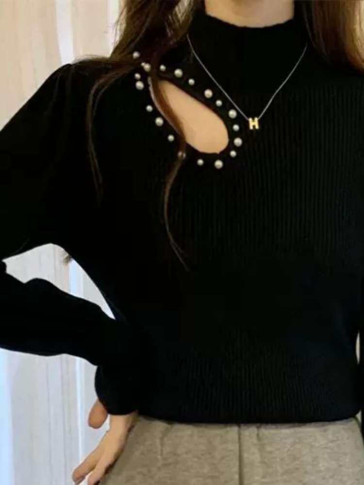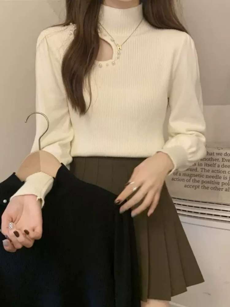 【即納】1点限定 デコルテビジューカットアウトリブニット オープン ニット ビジュー ハイネック コットン セーター カジュアル 無地 大きいサイズ 韓国 CH8073