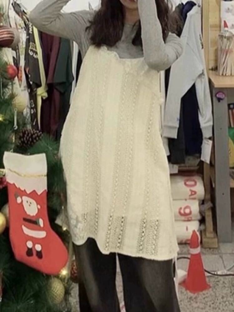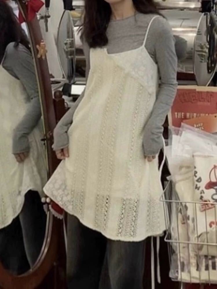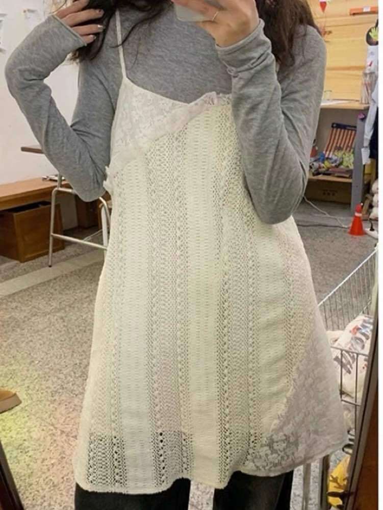 異素材レースの切り替えがおしゃれなロング丈のキャミソールビスチェです。