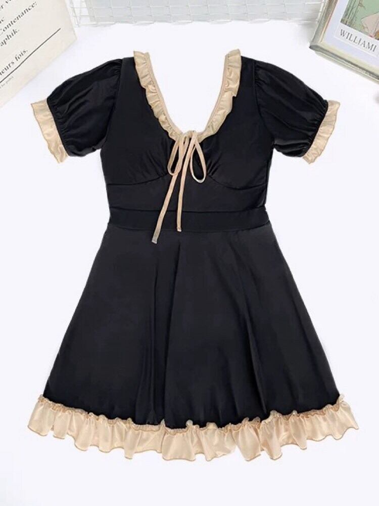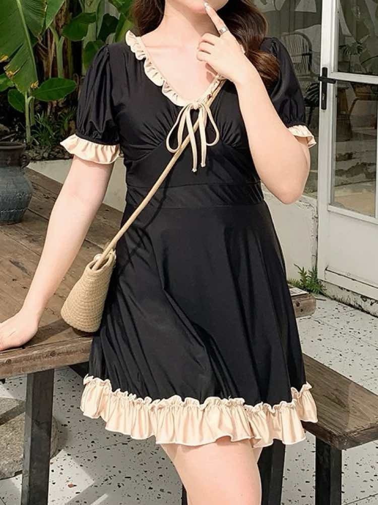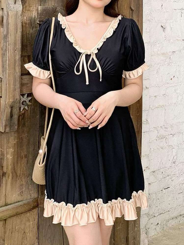 クラシカルな美シルエットをメイク バイカラーフロントリボンフリルワンピース水着 バイカラー フリル シック 大人可愛い ガーリー お洒落 Aライン リゾート 体型カバー 大きいサイズ 韓国 CH10669