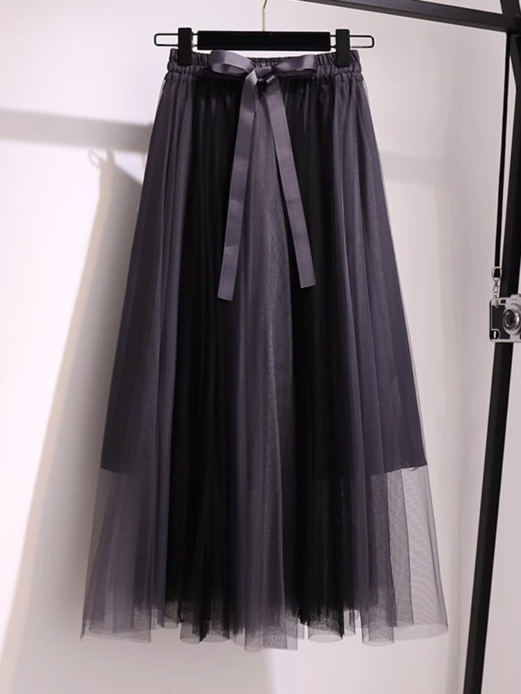 エレガントに魅せる上品なチュールスカート ウエストリボン ハイウエスト ロング ウエストゴム 裏地付き 大きいサイズ 韓国 CH9746