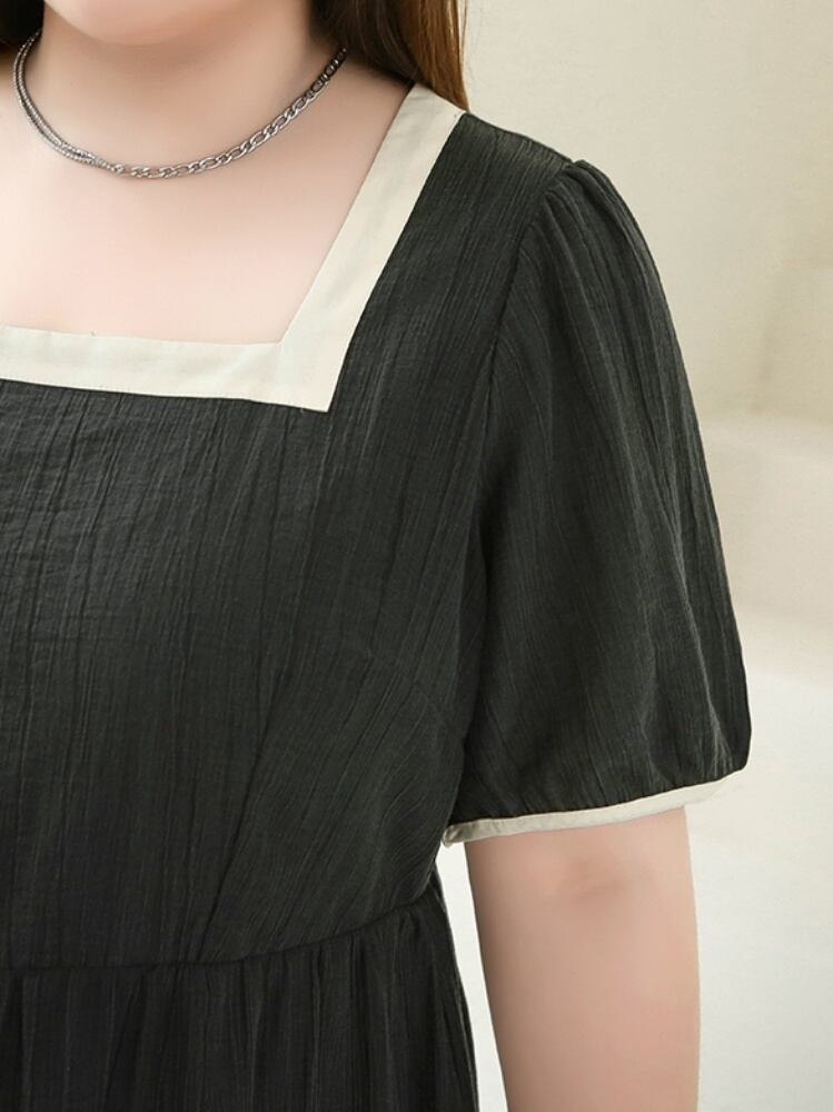 パフ袖で華やかエレガント パイピングワンピース スクエアネックフェミニン 大人可愛い Aライン ハイウエスト OL 大きいサイズ 韓国 CH9763