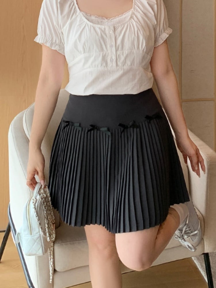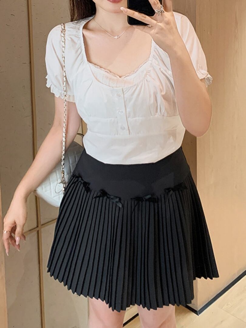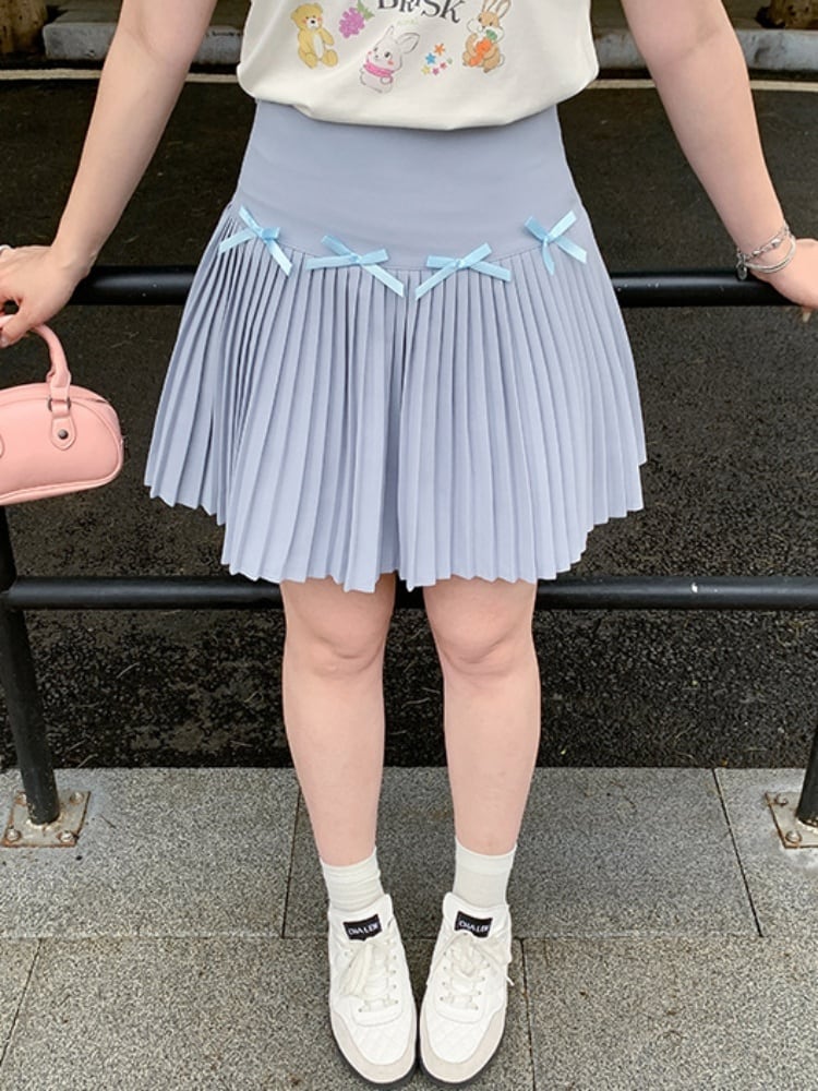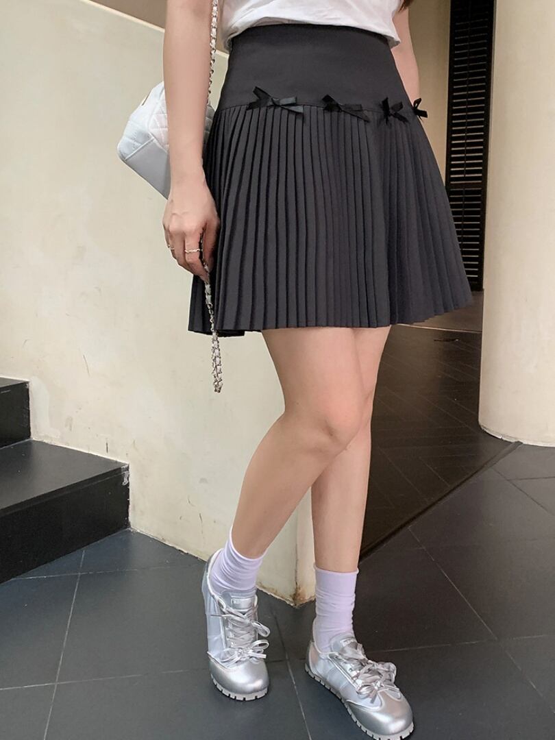 ラブリーリボン付プリーツミニスカート かわいい バレエコア おしゃれ見え スタイルアップ 大きいサイズ 韓国 CH9795