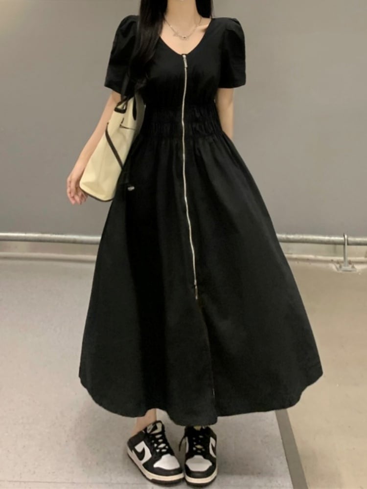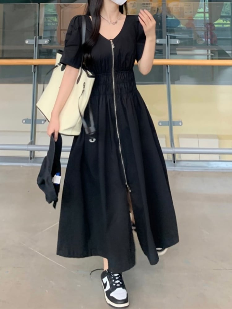 エッジの効いたアクセントで周囲と差がつく ジップアップヘップバーンスタイル ロングワンピース 半袖 Vネック かわいい 女子力アップ 大きいサイズ 体型カバー 韓国 CH9674