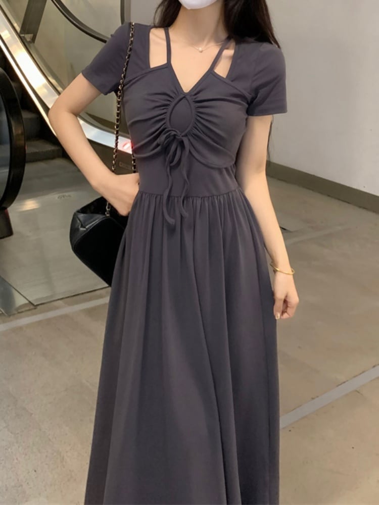 大人かわいいシックな夏スタイルが即完成♡歩くたびふわっと広がるドレープが美しいツーピース風のロングワンピースです♪