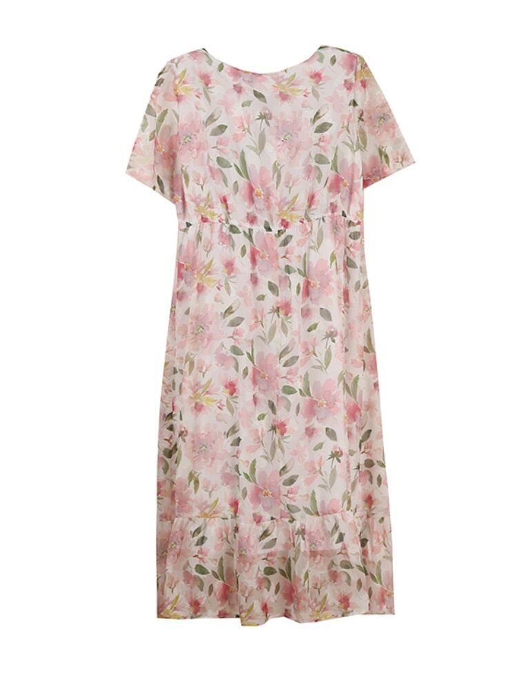 花柄が女性らしさUP ミモレ丈ワンピース ドレス 半袖 スクエア リボン 可憐 かわいい 大きいサイズ 韓国 CH9846