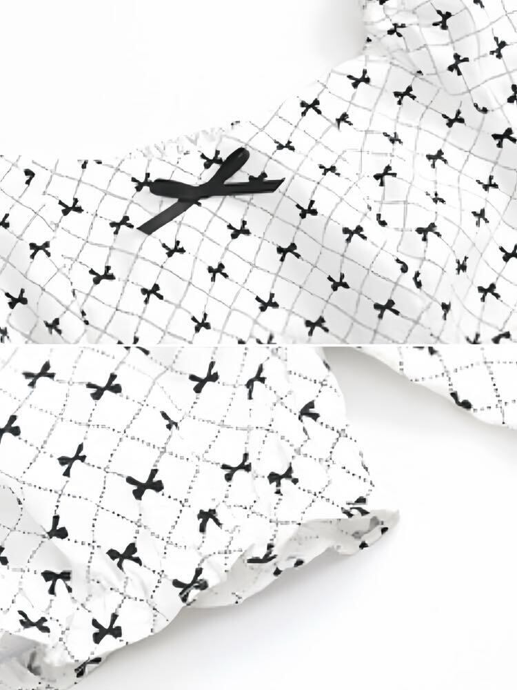 大人可愛い総柄で視線クギヅケ リボン柄キャンディスリーブトップス 半袖 リボン ぽわん袖 バイカラー 大人可愛い カジュアル 細見え 大きいサイズ 韓国 CH9840
