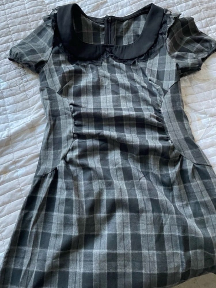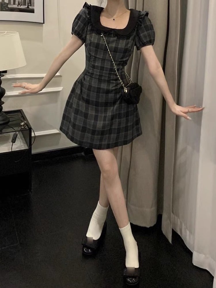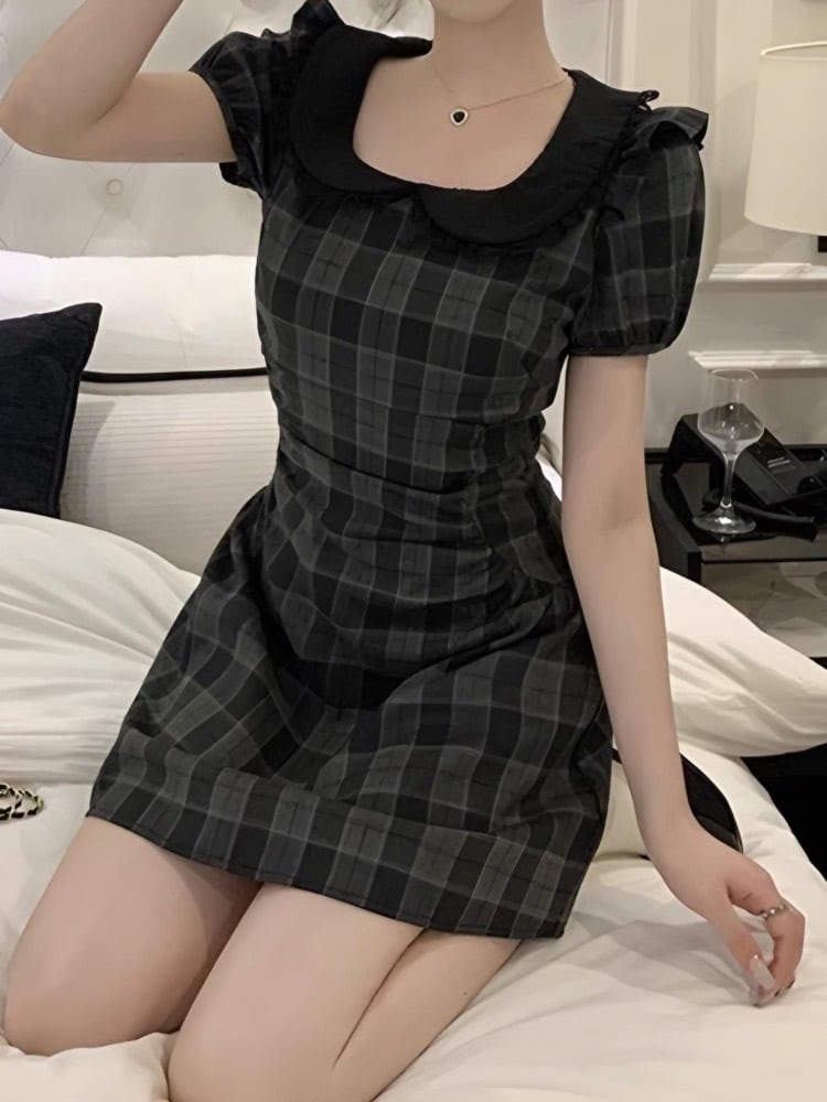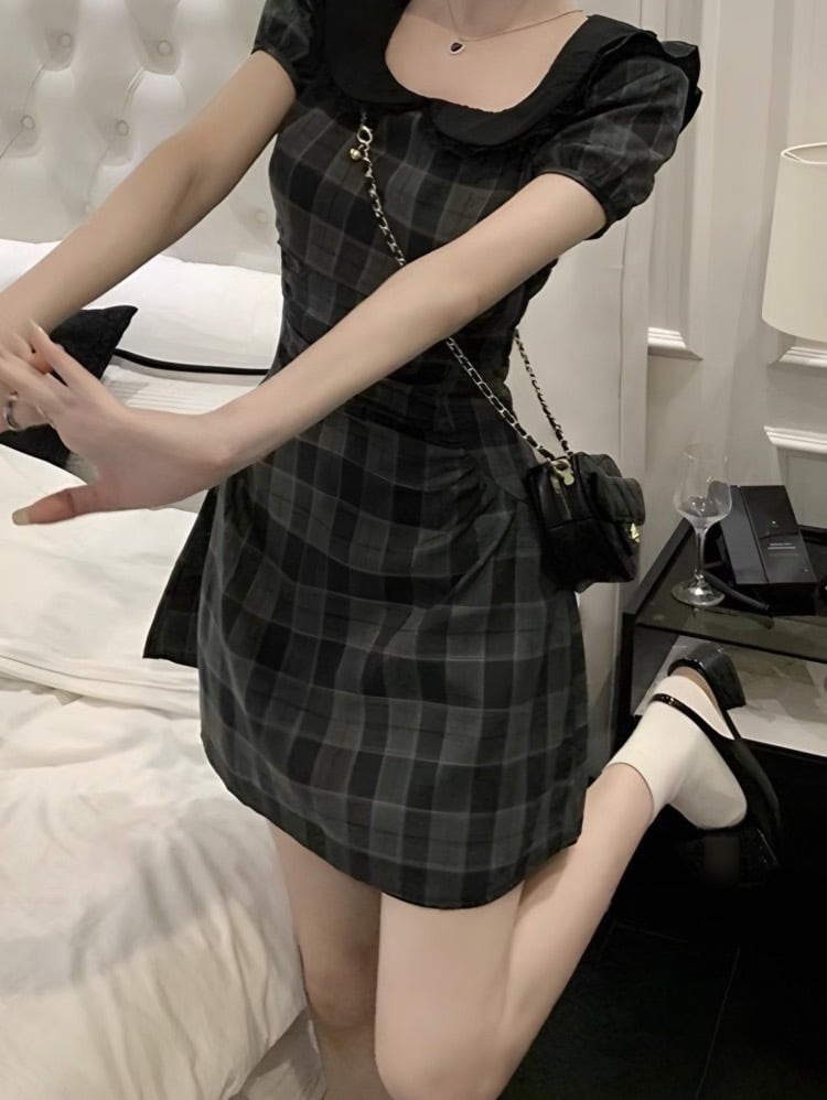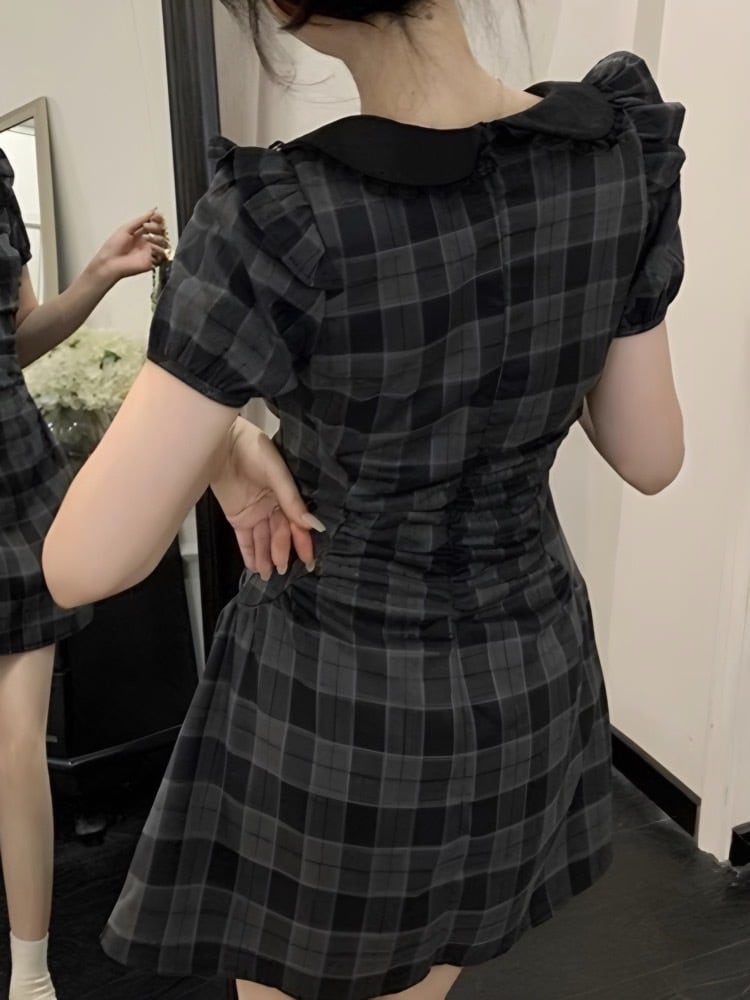 大人の甘さを演出 クラシックチェック柄パフスリーブワンピース ミニ丈 レトロ 襟付き 大きいサイズ 韓国 CH9931