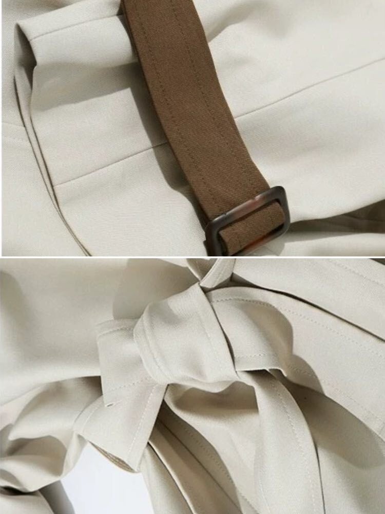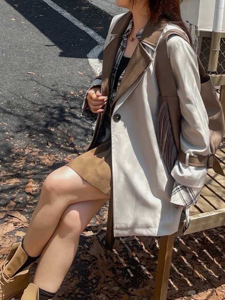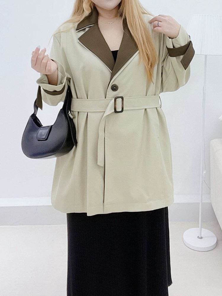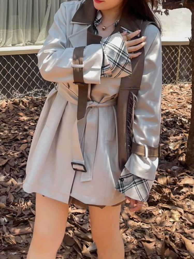 バイカラーのレイヤード風デザインが目を惹く、ファッショナブルな着こなしが叶うミドル丈のトレンチコート♡