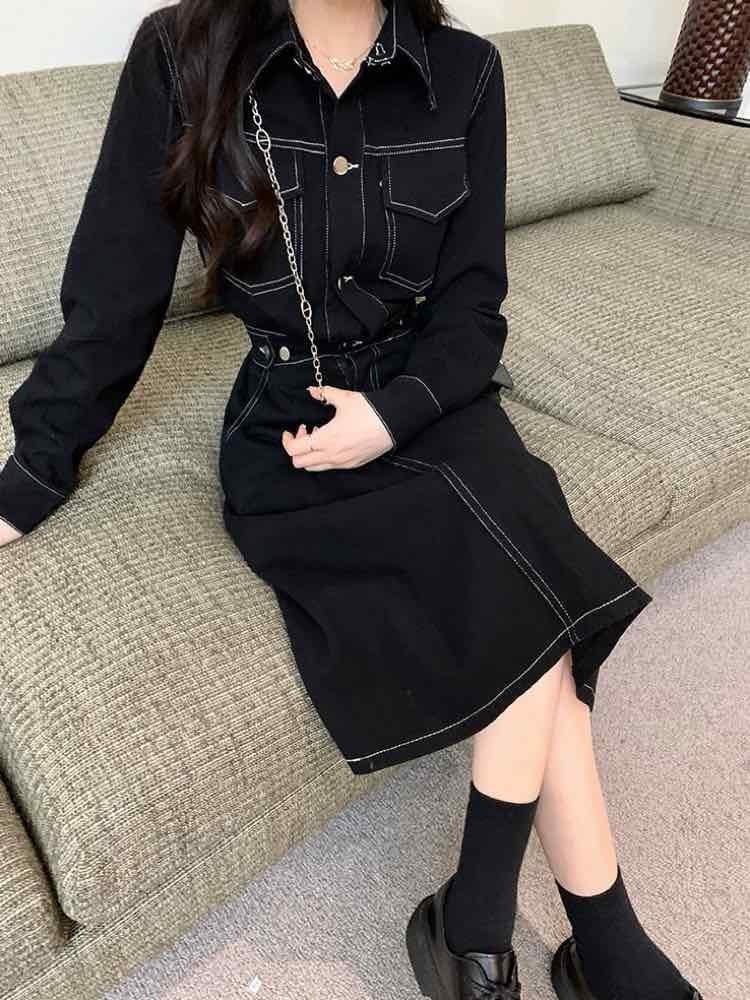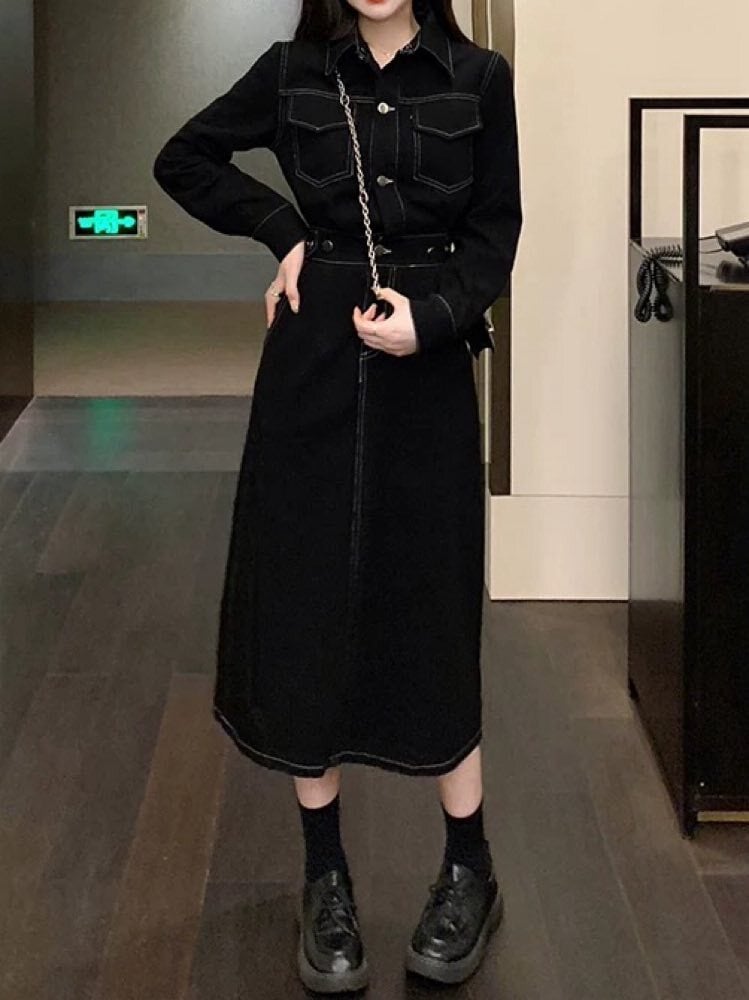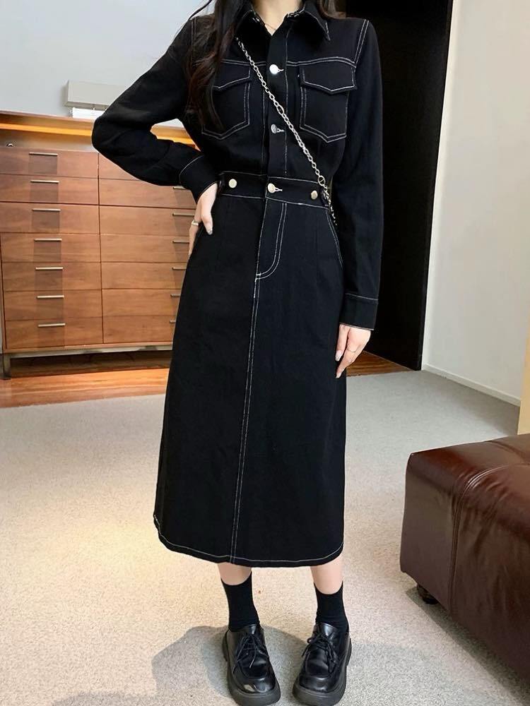 大人可愛い秋冬カジュアル セパレート風ミディ丈デニムワンピース 長袖 バイカラー ステッチ ポケット カジュアル おしゃれ 大人可愛い 細見え 秋冬 大きいサイズ 韓国 CH9845
