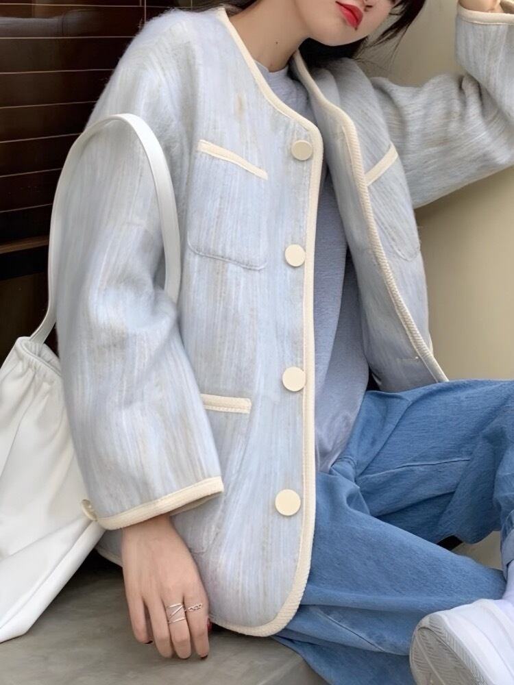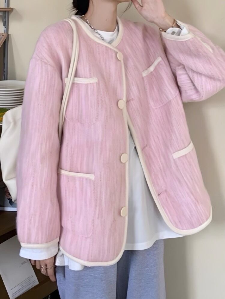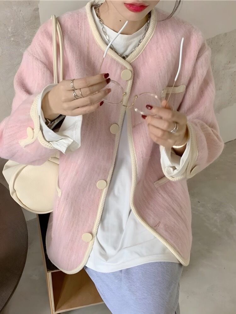 【即納】1点限定 柔らかい色味が女性らしい 配色ノーカラージャケット カジュアル オフィス 体型カバー 大きいサイズ 韓国 CH9593
