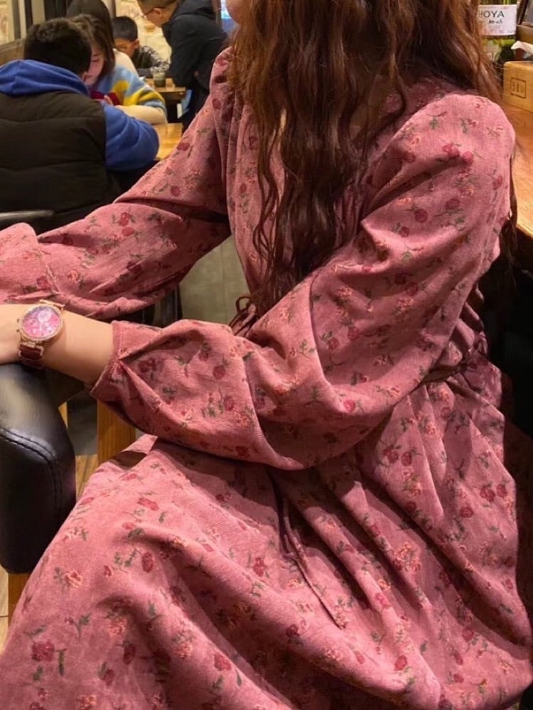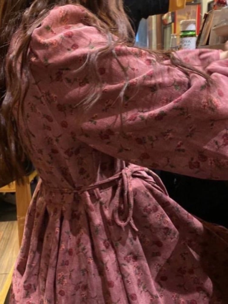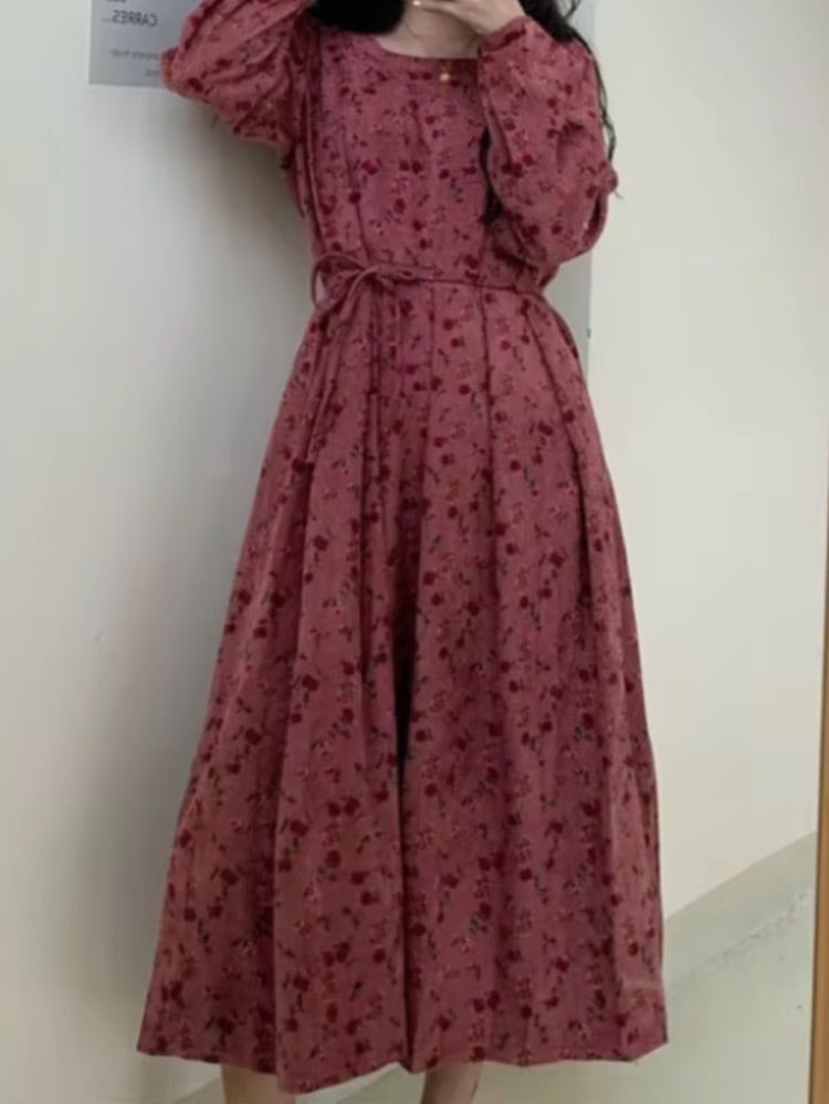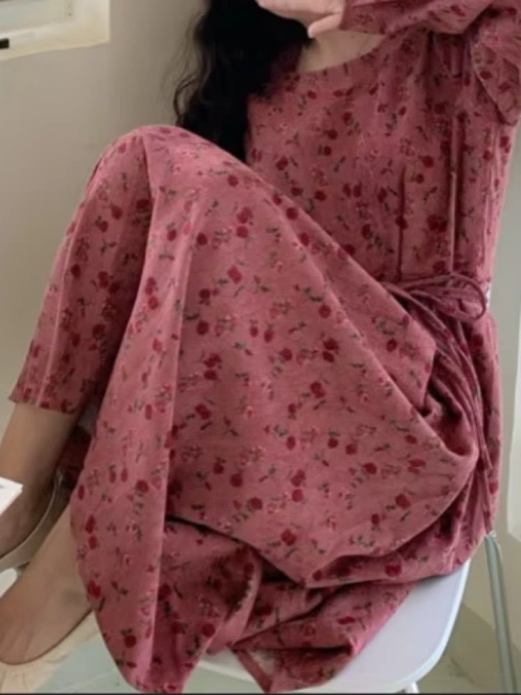 自然体の華やかさをプラス 薔薇柄リボンロングワンピース 上品 ローズプリントフェミニン ヴィンテージ 大人 大きいサイズ 韓国 CH9989